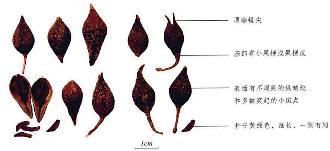 青翘多不开裂,表面绿褐色,凸起的灰白色小斑点较少:质硬;种子多数,黄绿色,细长,一侧有翅。