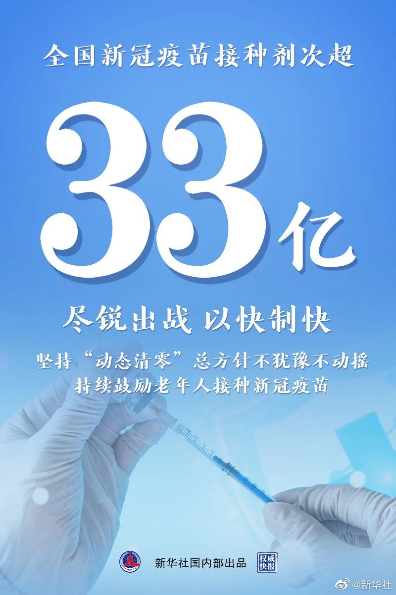 国家卫健委通报,全国新冠疫苗接种剂次超33亿。