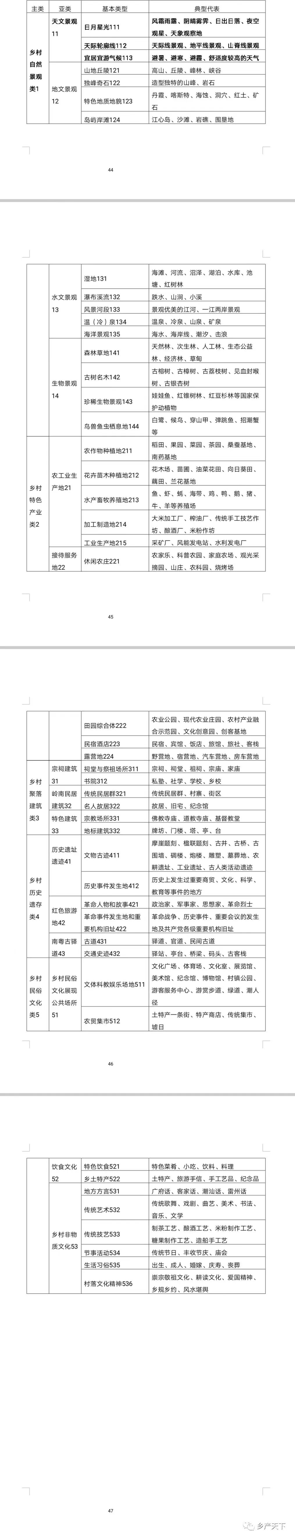 发展乡村休闲产业,应坚持规划引领。乡村休闲产业规划最基础的工作,是全面盘点在地资源,要注重从生产、生活、生态、文化、历史维度,以及农作物四时更替方面发掘特色乡村休闲吸引物。一、术语和定义1.乡村休闲旅游资源 Rural Leisure Tourism Resources在乡村地域范围内凡能对旅游者产生吸引力,以农业生产、农村生态、农民生活为主要内容,能满足旅游者审美、情感等需求,并可产生经济效益、社会效益和环境效益的各种事物和因素。2.湿地 wetland天然的或人工的,永久的或间歇性的沼泽地、泥炭地、水域地带,带有静止或流动、淡水或半咸水及咸水水体,包括低潮时水深不超过6米的海域,包括自然湿地、人工湿地。3.温泉 Hot Spring从地下自然涌出或人工采集,并含有多种对人体有益的矿物质及微量元素,且水温≥25℃的矿水。4.古树名木 Ancient and Famous Tree古树是树龄在100年以上的树木。名木是稀有、珍贵或者具有重要历史、文化、科学研究价值和纪念意义的树木。5.休闲农庄 Recreation Grange有明确的区域范围和经营主体,具备一定生产规模,休闲服务功能突出,文化特色鲜明的农业园区。6.田园综合体 Rural Complex以农民合作社为主要载体、让农民充分参与和受益,集循环农业、创意农业、农事体验于一体乡村综合发展项目。7.乡村民宿Rural Homestay乡村民宿是指乡村居民利用自己拥有所有权或者使用权的住宅或者其他条件开办的,民宿主人参与接待,为旅游者提供体验当地自然景观、特色文化与生产生活方式的小型住宿设施。单幢建筑的客房数量不超过14间(套)。8.酒店Hotel以间(套)为单位出租客房,以提供住宿服务为主,并提供商务、会议、休闲、度假等相应服务的住宿设施。9.露营地Camping Site使用自备或租赁设备,以在野外临时住宿和休闲生活为主要目的活动场所。10.传统民居群 Traditional Dwellings具有较强建筑特色和较大规模体量的岭南传统房屋建筑群落或自然村寨。11.红色革命遗址 Red Revolutionary Site自鸦片战争以来,为了国家昌盛和民族复兴作出贡献的仁人志士和相关事件,尤其是中国共产党领导人民在革命和战争时期建树丰功伟绩所形成的纪念地、标志物。12.南粤古驿道 Guangdong Old Post Roads南粤古驿道是指1913年前广东省辖区内用于传递文书、运输物资、人员往来的运用传统技艺修建的通道,包括驿道(官道)和民间古道,是广东历史上经济交流和文化传播的重要通道。13.乡村公共服务设施 Rural Public Service Facilities各类文化、体育、科技、教育、娱乐等农村群众活动场地和设施。14.乡村非物质文化遗产 Rural Intangible Cultural Heritage村民世代相传并视为其文化遗产组成部分的各种传统文化表现形式,以及与传统文化表现形式相关的实物和场所。二、广东省乡村休闲旅游资源分类1.分类对象具有一定面积、规模、体量或等级,并具有一定休闲旅游开发价值的各种事物和现象,包括物质和非物质的存在形态。2.分类结构分为“主类”、“亚类”、“基本类型”3个层次。典型代表是对基本类型的具体举例。每个层次的资源类型采用数字编号,如123代表第1种主类下,第2种亚类的第3种基本类型。广东省乡村休闲旅游资源分类体系来源 | 广东省农业农村厅
