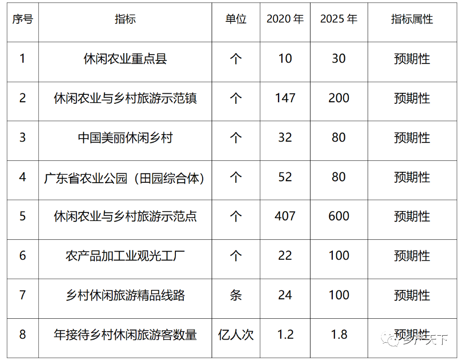到2025年,全省乡村休闲产业发展成为城乡融合、产业融合的重要载体,整体发展水平走在全国前列,乡村休闲旅游人次达1.8亿。珠三角都市农业、水乡文化一体化发展,助力打造粤港澳大湾区休闲湾区、世界级旅游目的地;沿海两翼休闲渔业、滨海风情以及潮汕、雷琼传统村落联动发展,打造乡村休闲旅游产业带;北部生态发展区休闲产业生态化、农业生态产业化同步发展,客家文化、少数民族风情特色凸显,打造粤北生态旅游圈。乡村休闲产业体系优化。促进“4321”区域关联乡村休闲经营主体产业协作、产业融合,提高资源配置效益。开发推介乡村休闲精品线路100条,建设农产品加工业观光工厂100个。乡村休闲产品品牌响亮。持续开展乡村休闲旅游精品创建、推介活动,“休闲农业重点县、休闲农业与乡村旅游示范镇、中国美丽休闲乡村、广东农业公园、休闲农业与乡村旅游示范点”品牌系列影响力显著提升。展望2035年,全省乡村休闲产业打造成千亿规模美丽经济产业集群,年接待休闲观光游客3亿人次以上,建成1-2个有世界知名度和影响力的休闲农业重点县。乡村休闲产业高质量发展上新台阶,农业与科技创新、文化创意、信息要素、生物技术等融合更深,生态环境更加优美、岭南特色更加凸显、管理服务更加精细。表1:“十四五”期间全省乡村休闲产业发展主要指标