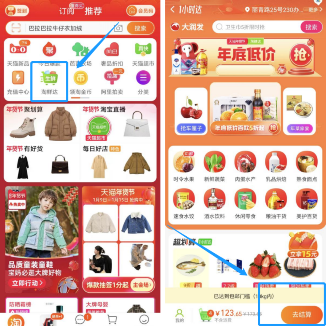 方法1:打开手机淘宝—首页点击“淘鲜达”进入选购页面