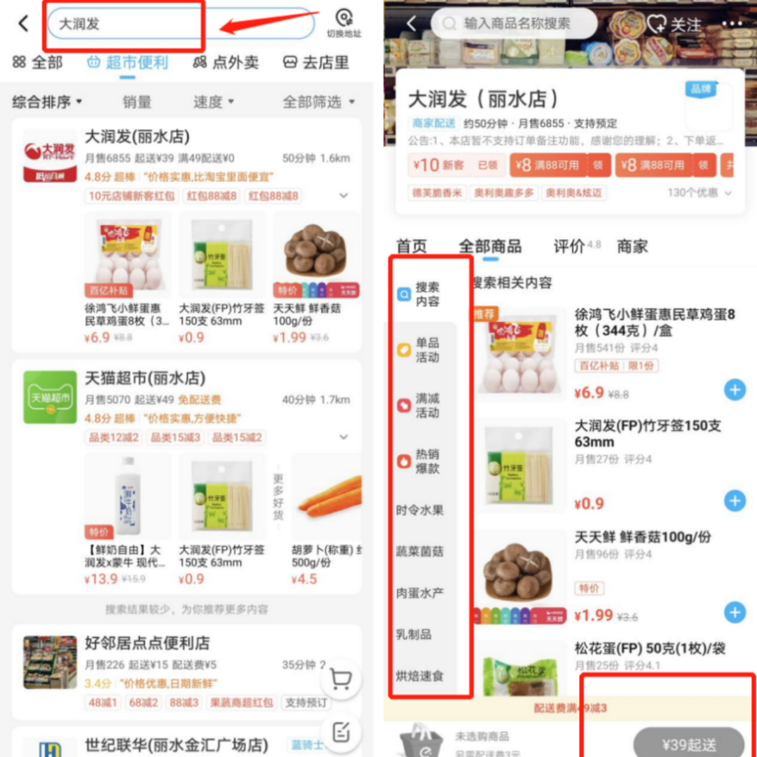 方法2:打开饿了么—搜索“大润发”,点击进入选购页面