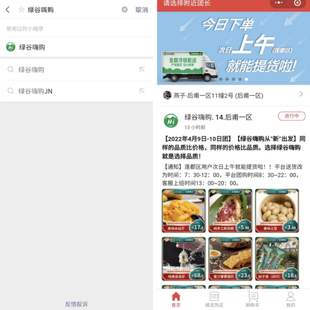 下单方式:登录—搜索小程序“绿谷嗨购”点击进入,选择加入离您最近的团长,再开始选购下单,物品将配送到相应点位自提。