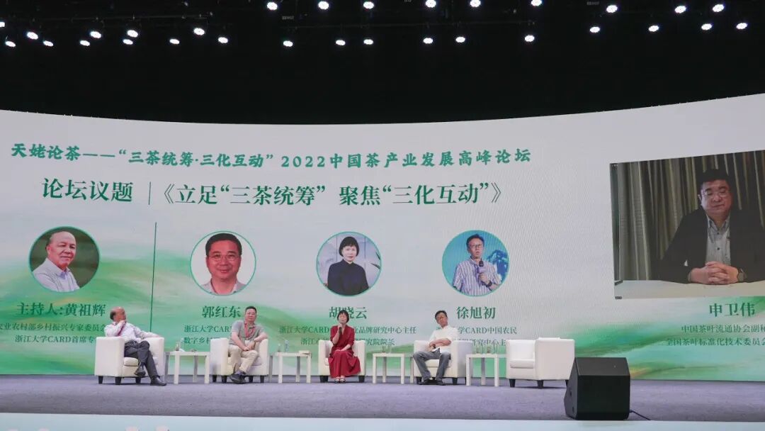 中国茶叶流通协会副秘书长申卫伟、浙江大学CARD中国数字乡村研究中心主任郭红东、浙江大学CARD中国农业品牌研究中心主任胡晓云、浙江大学CARD中国农民合作组织研究中心主任徐旭初等专家围绕《立足“三茶统筹” 聚焦“三化互动”》展开对话。