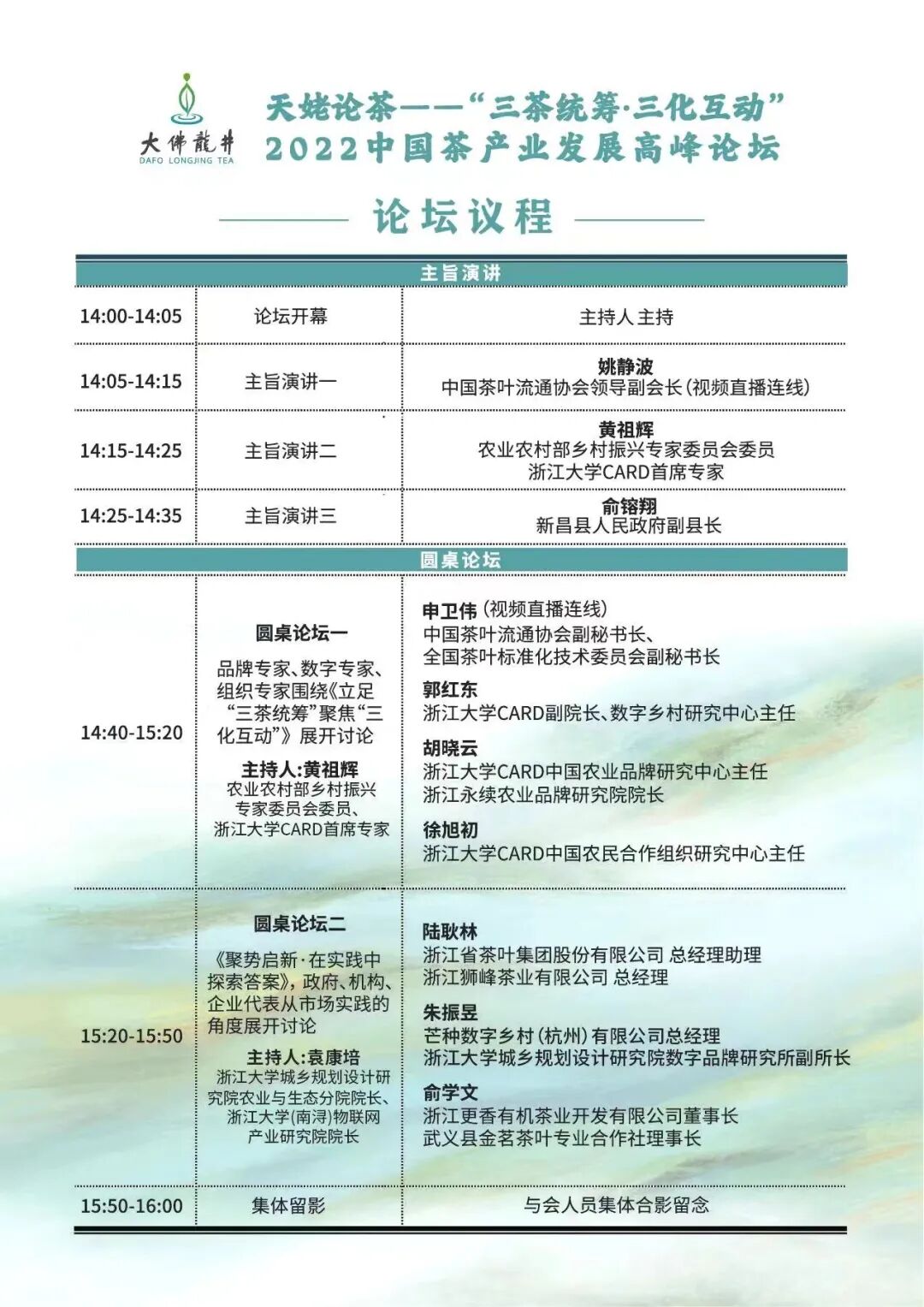 杭州市西湖龙井茶管理协会副会长陆耿林,芒种数字乡村(杭州)有限公司总经理、浙江大学城乡规划设计研究院数字品牌研究所副所长朱振昱,浙江更香有机茶业开发有限公司董事长俞学文等从不同实践角度围绕论坛主题开展了讨论。两场对话分别由农业农村部乡村振兴专家委员会委员黄祖辉、浙江大学城乡规划设计研究院农业与生态分院院长袁康培主持。浙江大学中国农村发展研究院致力于探索品牌化、组织化、数字化“三化”协同助推乡村产业振兴研究,被中国社会科学评价研究院入选为“2021年中国智库特色案例”。新昌县聚力数字赋能、茶旅融合、全链提升、价值再造,形成了一条以“大佛龙井”为主导,“天姥红茶”“天姥云雾”为补充的“一体两翼”茶产业发展的“新昌模式”。本次论坛聚合政府领导及各界专家学者的能量,就新昌茶品牌、茶文化、茶产业、茶科技发展现状进行分析和对话,助推新昌深度发挥资源优势,着力打造提升版“新昌模式”。 有关专家观点将在后续报道中持续推出,敬请关注。