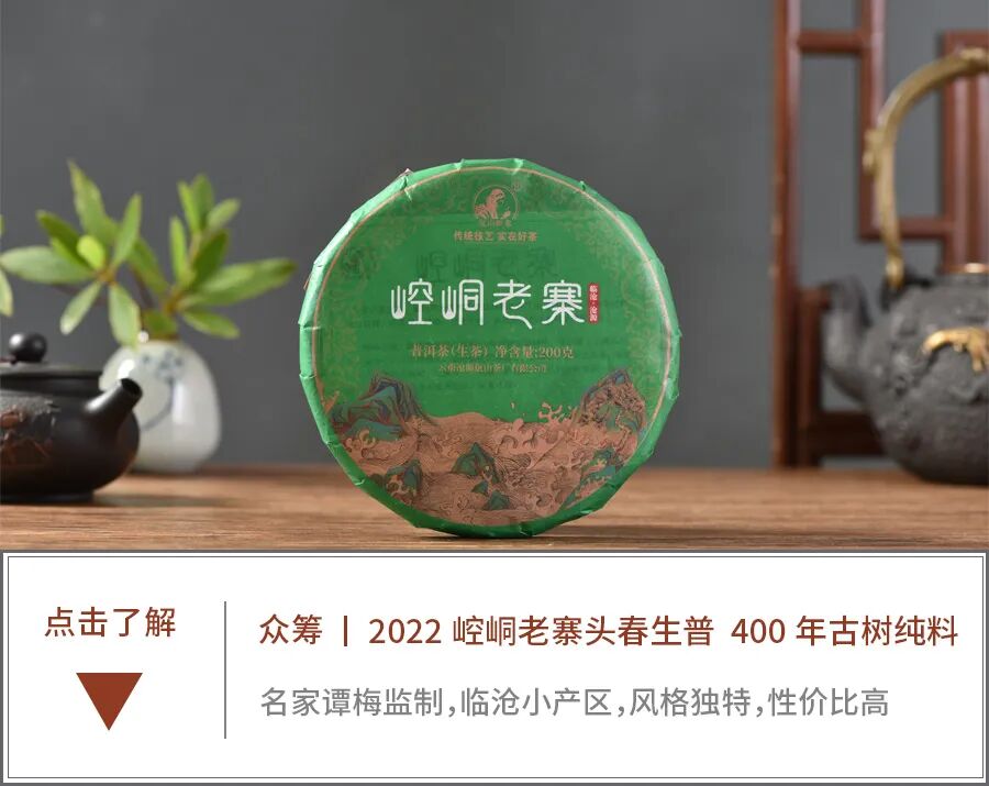 2022年崆峒老寨头春纯料生普预售开启!高性价比古树生普,临沧小产区崆峒老寨,400年古树群落,原始生态,环境优越。制茶名家谭梅品质把控,风格独特,融合勐库之高香,布朗之醇涩,临沧之清甜,给人与众不同的古树春茶体验。限时福利价,不容错过!扫描下方二维码即可参与众筹……