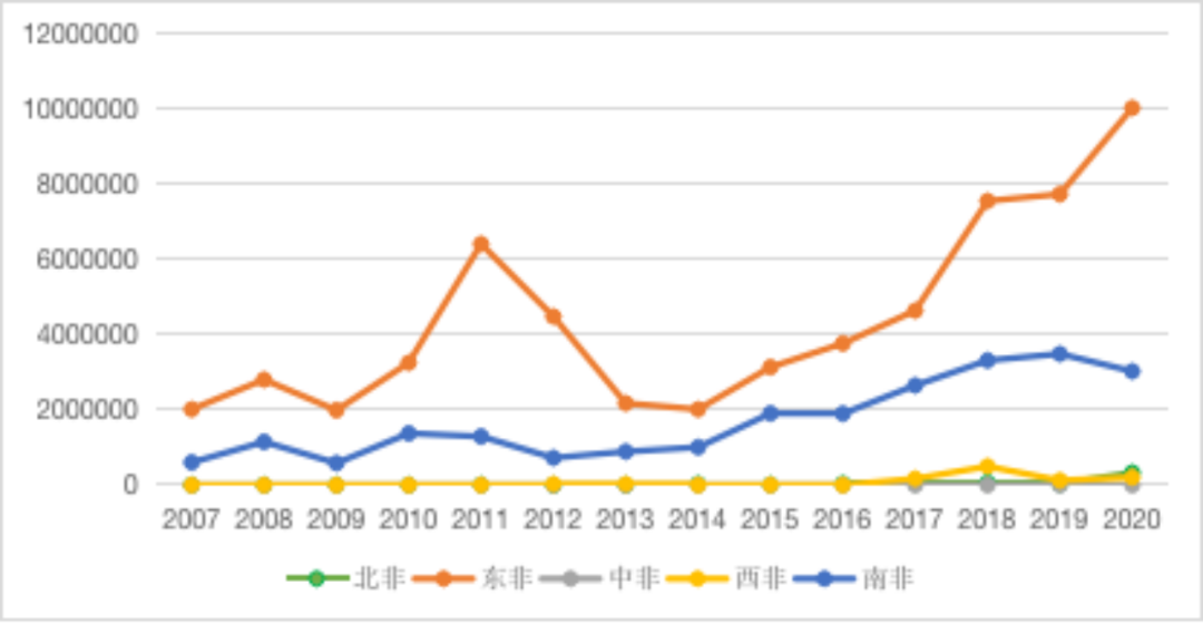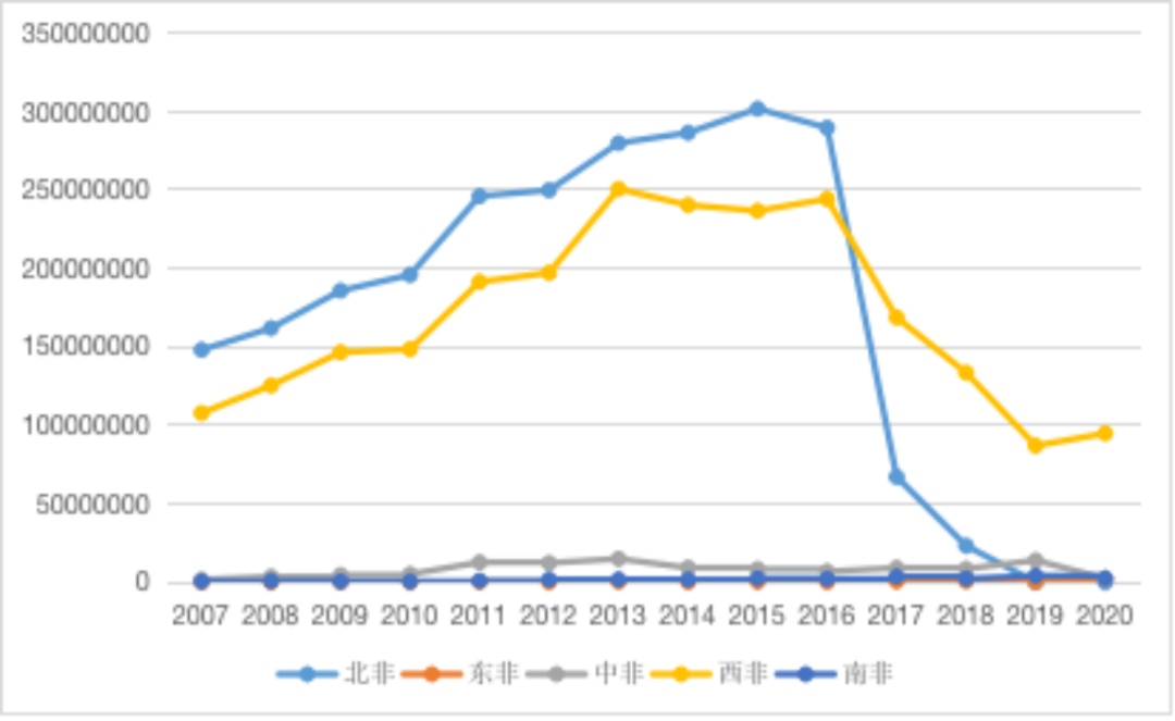 非洲共有54个国家,可以划分为5个地区,分别是非洲北部、非洲东部、非洲中部、非洲西部以及非洲南部。将非洲分为5个地区来分析从中国与非洲的茶叶双向贸易情况能够更加清晰地看出未来中非茶叶贸易的发展趋势。图 5 2007-2020年中国从非洲各地区进口茶叶贸易额(美元)