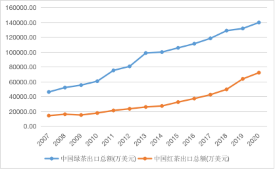 图 2 2007-2020年中国绿茶和红茶出口总额