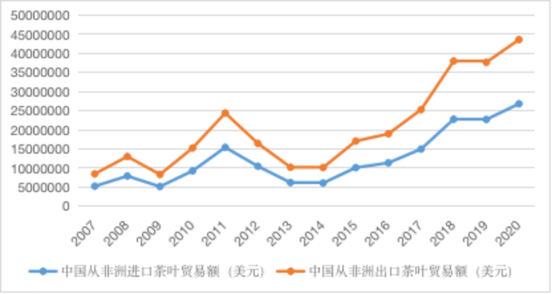 从中国与非洲茶叶双向贸易情况来看,我国主要是向非洲出口茶叶,向非洲出口茶叶的贸易额要远远大于从非洲进口茶叶的贸易额。整体来看,中非茶叶双向贸易呈上升趋势,但波动幅度较大。2017年之前,无论是中国向非洲出口茶叶还是非洲向中国出口茶叶,在贸易总额上都没有较大的突破。从2018年开始,中非茶叶双向贸易有了更大程度的增长,双方在茶叶贸易上有了更进一步的发展。图 4 2007-2020年中非茶叶双向贸易