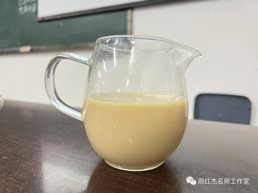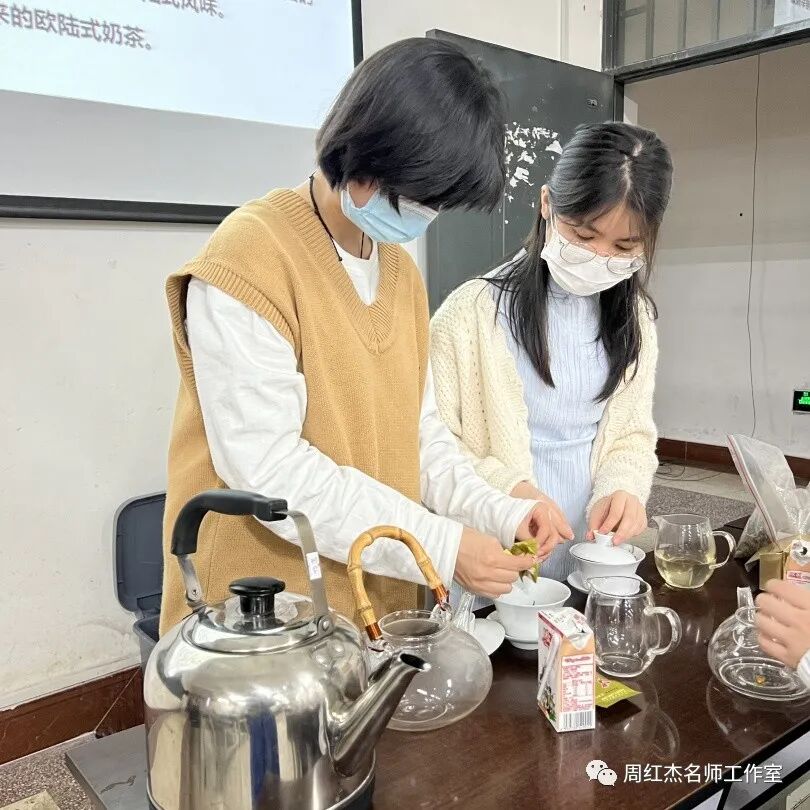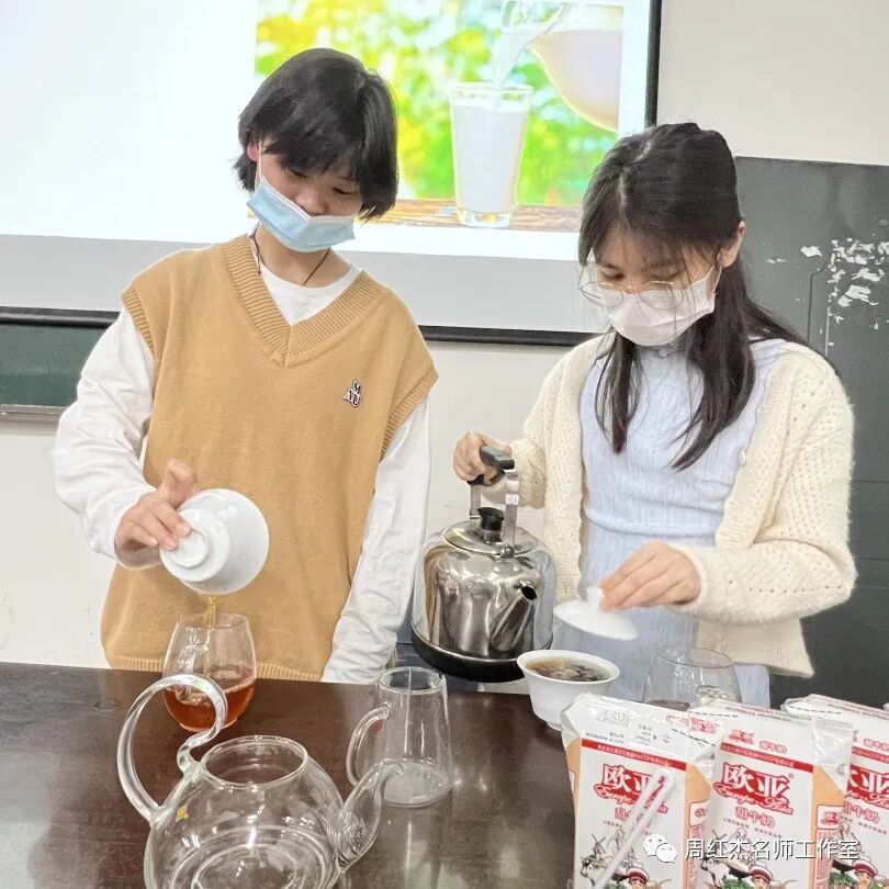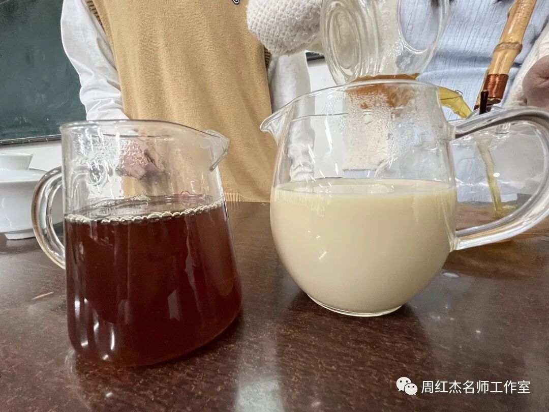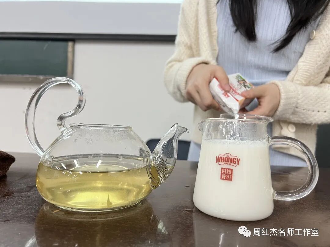 在李老师给同学们讲解精彩内容的同时,研究生助教在现场给同学们展示奶茶的冲泡,一起品饮奶茶。此次给同学们准备了绿茶奶茶,红茶奶茶,普洱熟茶奶茶,让同学们感受不同茶类制作的奶茶在香气、滋味、颜色上的区别。