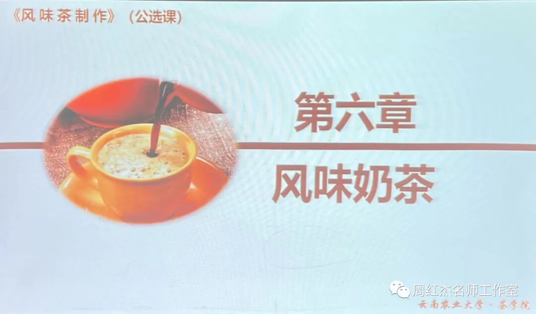 李老师在回顾了上节课的内容之后,便开启新篇章——《风味奶茶》,新篇章的内容包括奶茶概述、奶茶调制方法、风味奶茶实例。