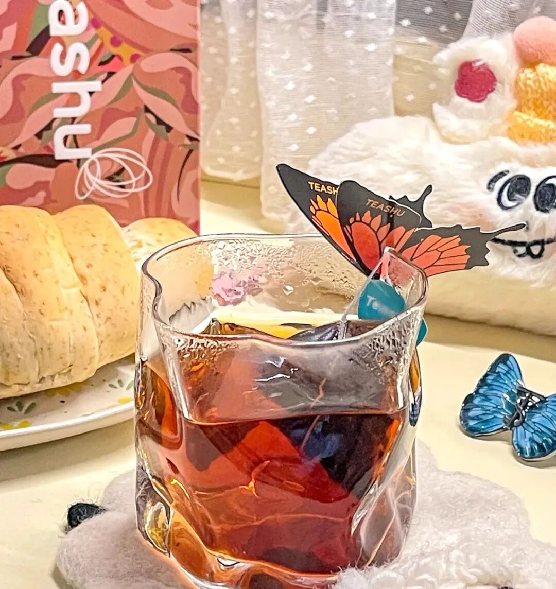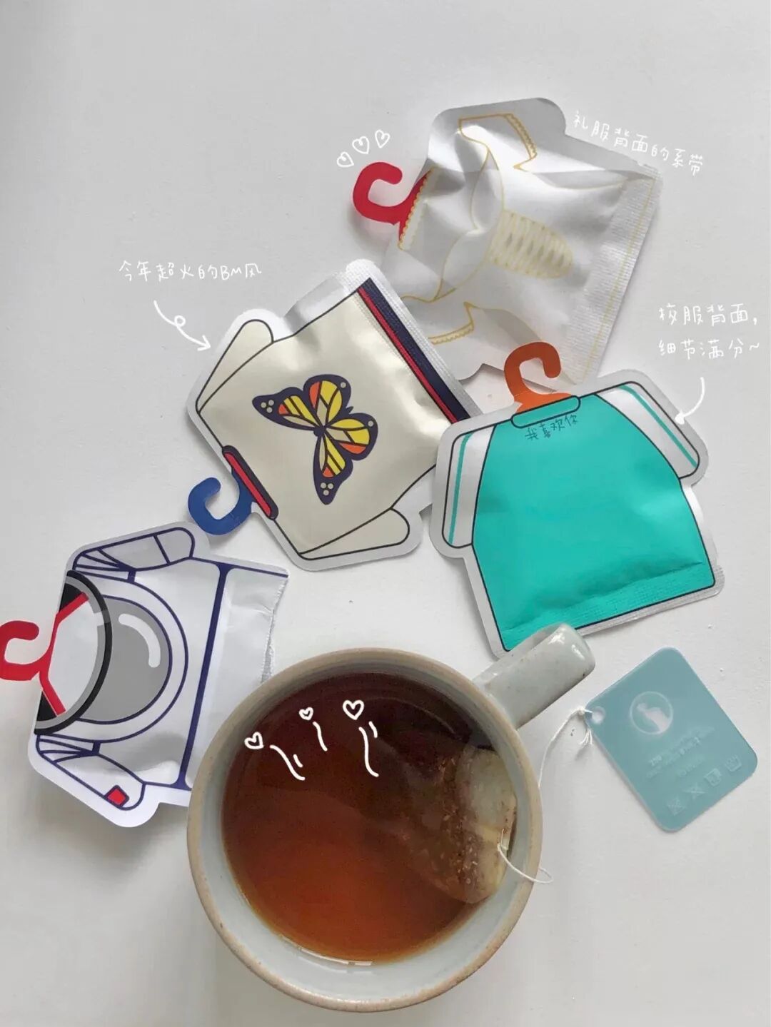 有人专注于茶包设计,有人就在杯挂上下功夫,这款蝴蝶茶包设计得十分逼真,色彩明亮,展翅欲飞,营造了一种蝴蝶亲吻杯口的感觉。