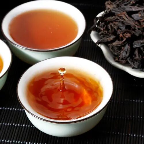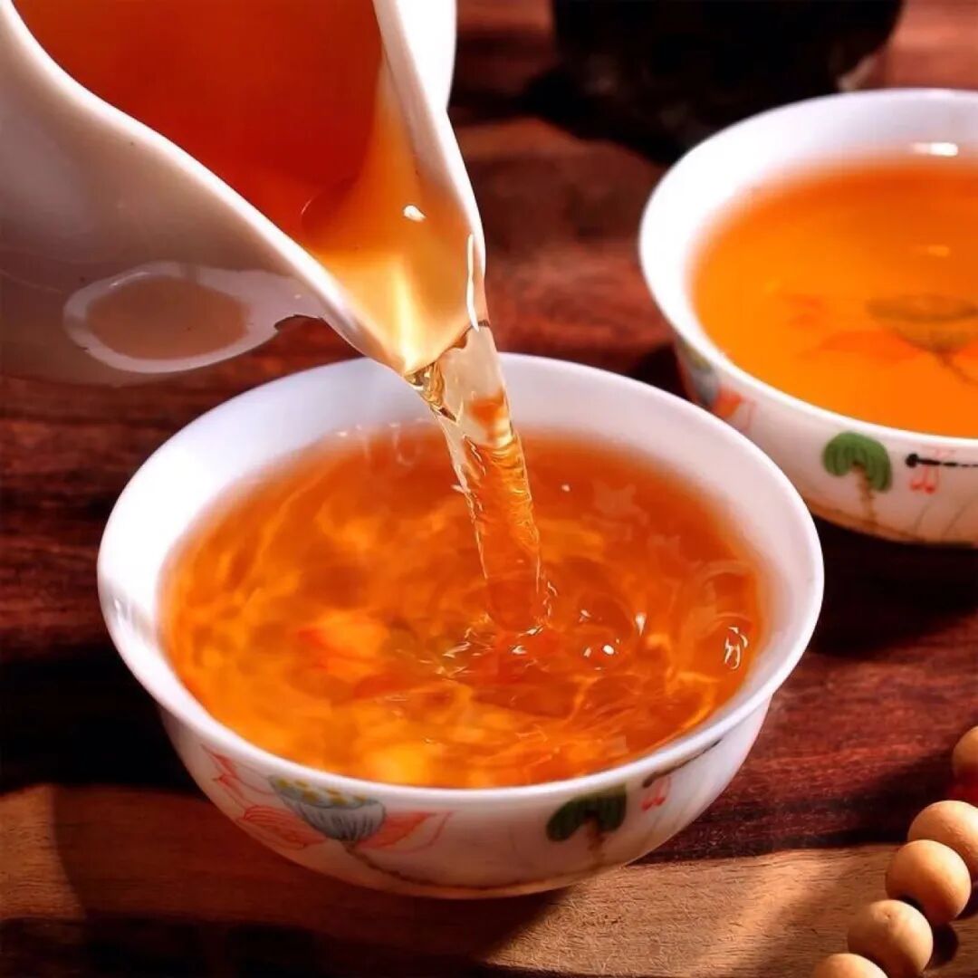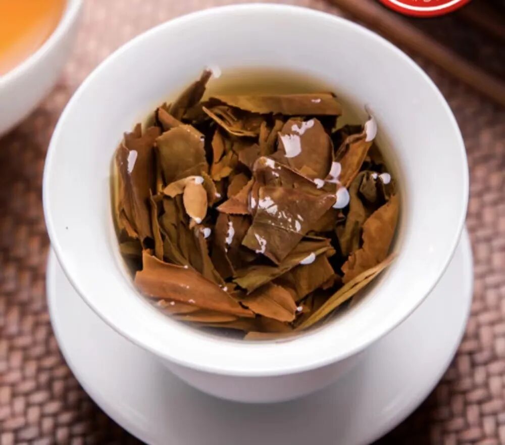 制作中采用古法压制,保存叶底完整,叶底肥厚呈红褐色,质地饱满,新鲜感十足。汤色明黄而透亮,陈韵明显而久香不去,入口浓稠,甘润醇厚,茶气香浓。