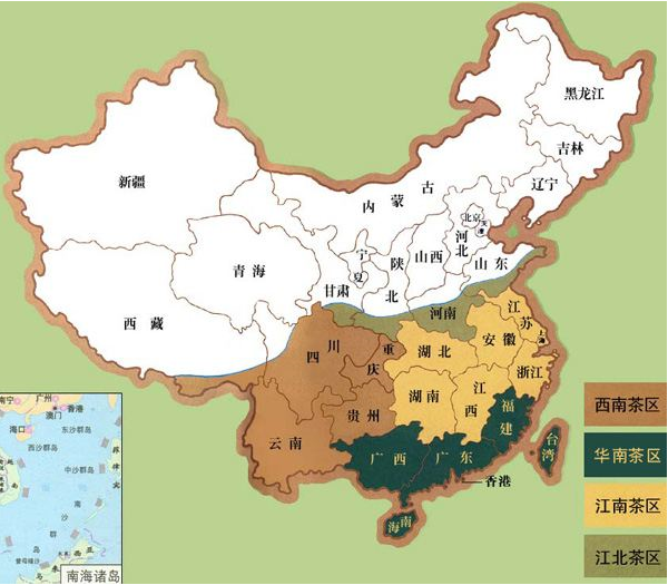 我国地域辽阔,产茶地众多,依地理位置、生态条件和产茶特点,分为江南、江北、华南、西南四大茶区。