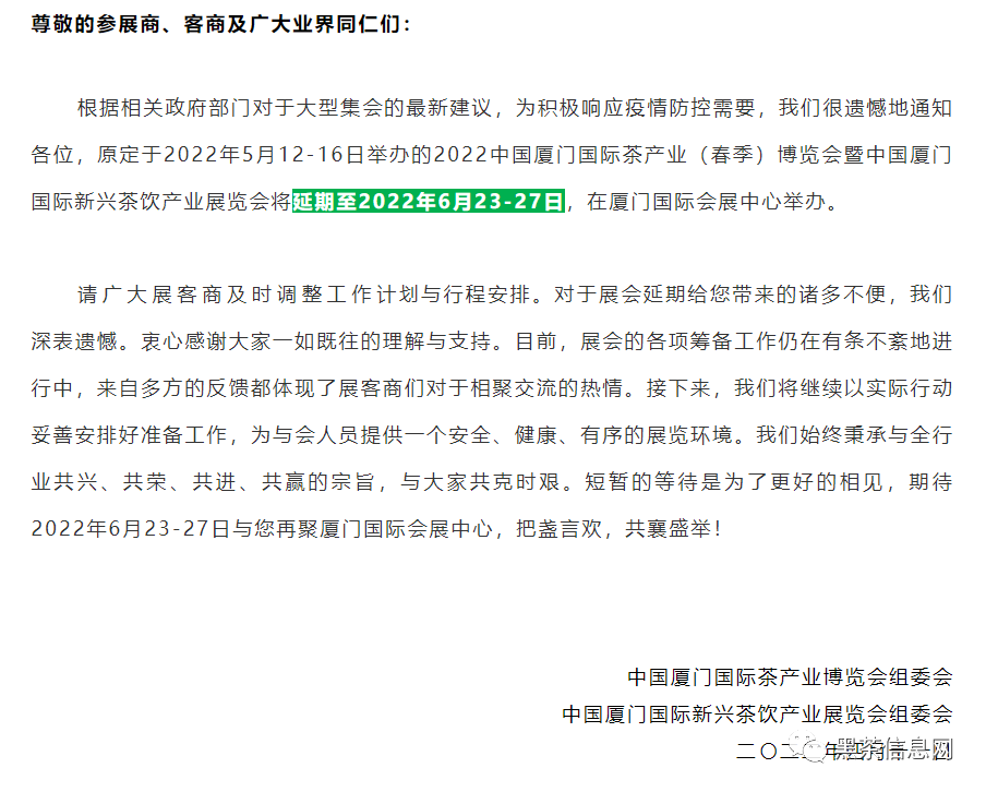 2022中国厦门国际茶产业(春季)博览会将延期至6月23-27日举行