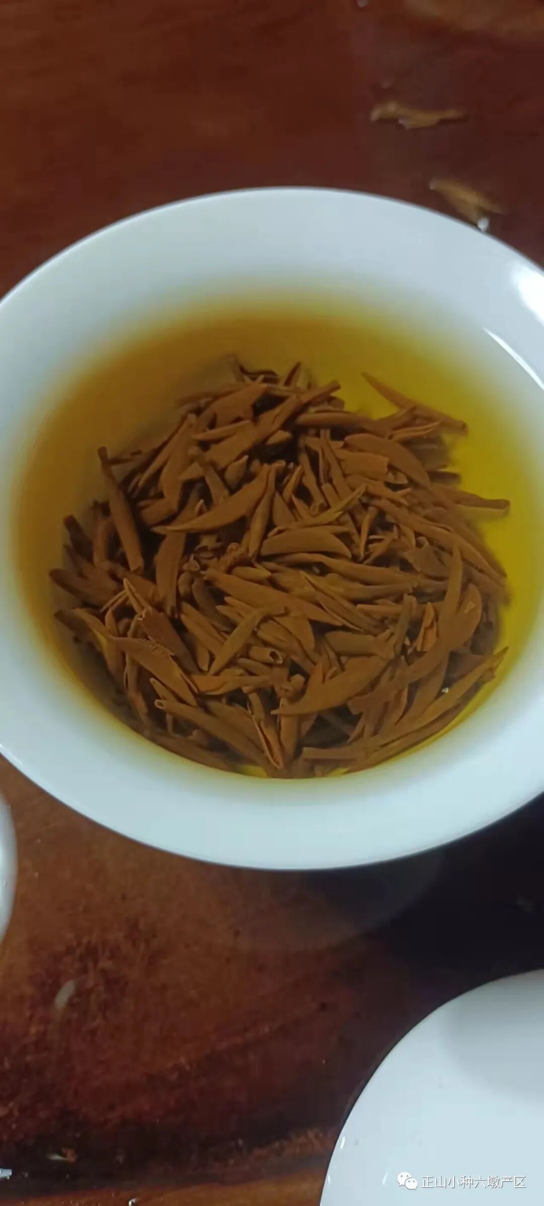 看看茶芽绿色的样子。 最后给大家说一下我自己喝起来的感受:首先干茶闻起来花果香蜜香扑鼻,沸水冲泡不用洗茶(洗茶太浪费)5秒出茶汤颜色并不显,淡黄,但是花果香甜香突显,闻着舒服,口感滑口比较烫(建议放温来喝),第一道茶汤同样5秒左右出汤,金黄汤色开始突显,类似水蜜桃的果香开始显现,甜感加深,口感更佳滑口,之后每一道汤色基本不变,后期需坐杯,香气,口感,甜感依然落差不大。比较单一,单纯的味道。上述只是我个人感受,能喝到我金骏眉都是信任,靠谱的茶农只说靠谱的话。点个关注,谢谢