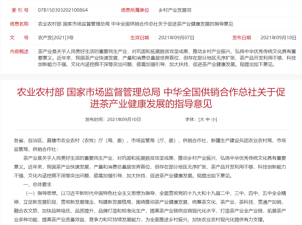 2021年,农业农村部、国家市场监督管理总局、中华全国供销合作总社正式出台《关于促进茶产业健康发展的指导意见》。各地积极响应,认真筹谋。科技兴茶、绿色兴茶、质量兴茶、品牌兴茶、文化兴茶再次成为热点。在农业农村部的指导下,根据适区适种原则,茶产业调整优化布局,目前已形成了长江中下游名优绿茶、东南沿海优质乌龙茶、长江上中游特色和出口绿茶、西南红茶和特种茶等四大优势区域,生产集中度达到80%以上。同时,各地深入开展化肥农药使用量零增长行动,大力推广绿色防控技术,使茶叶主产区的生态环境明显改善,产品质量明显提高。全国茶叶病虫害绿色防控覆盖率达57.5%。