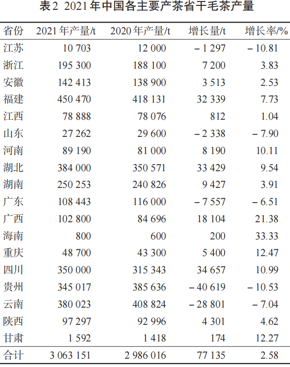 2021年,全国干毛茶总产量约306.32万t,比增7.71万t,增幅2.58%。产量超过30万t的有福建省、湖北省、云南省、四川省、贵州省(表2)。