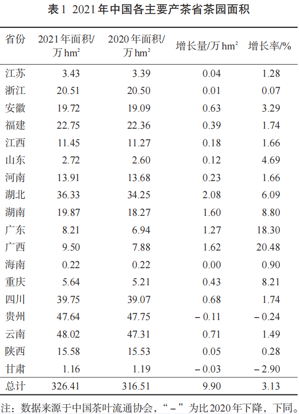 据统计,2021年,全国18个主要产茶省 (自治区、直辖市)的茶园总面积为326.41万hm²,同比增加9.90万hm²,增幅3.13%(表1)。其中,可采摘面积291.64万hm²,同比增加15.23万hm²,增长5.22%。可采摘面积超过20 万hm²的省份有云南省(45.70 万hm²)、贵州省(42.89 万hm²)、四川省(32.49 万hm²)、湖北省(28.07 万hm²)、福建省(21.67万hm²)。