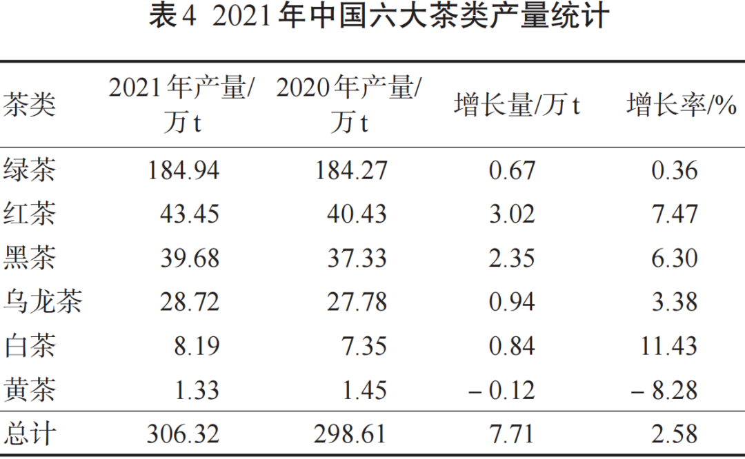 2021 年,中国传统茶类中,除黄茶外,其余五大茶类的产量均有不同幅度增长。其中,绿茶184.94 万 t,微增 0.67 万 t,比增 0.36%;红茶43.45 万t,增长3.02 万t,比增7.47%;黑茶39.68万t,增长2.35 万t,比增6.3%;乌龙茶28.72 万t,增长0.94 万t,比增3.38%;白茶8.19万t,增长0.84万t,比增11.43%;黄茶1.33万t,减少0.12万t,降幅为8.28%(表4)。绿茶、红茶、黑茶、乌龙茶、白茶、黄茶的产量比约为139∶33∶30∶22∶6∶1;红茶、黑茶、白茶在总产量中的占比出现攀升。
