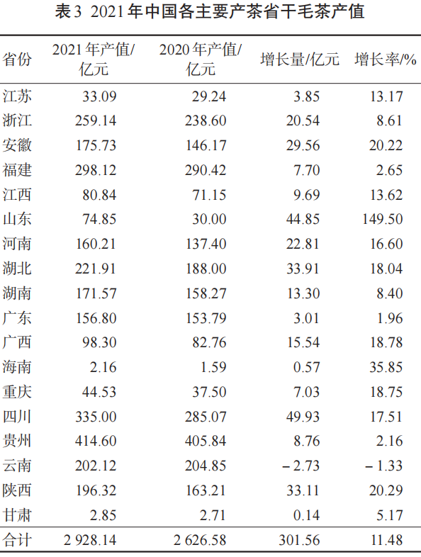2021年,全国干毛茶总产值为2928.14亿元,增长301.56亿元,增幅11.48%。产值增长量超过30亿元的省份有四川省、山东省、湖北省、陕西省(表3)。