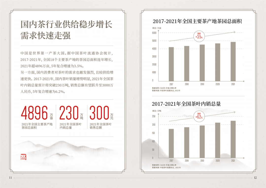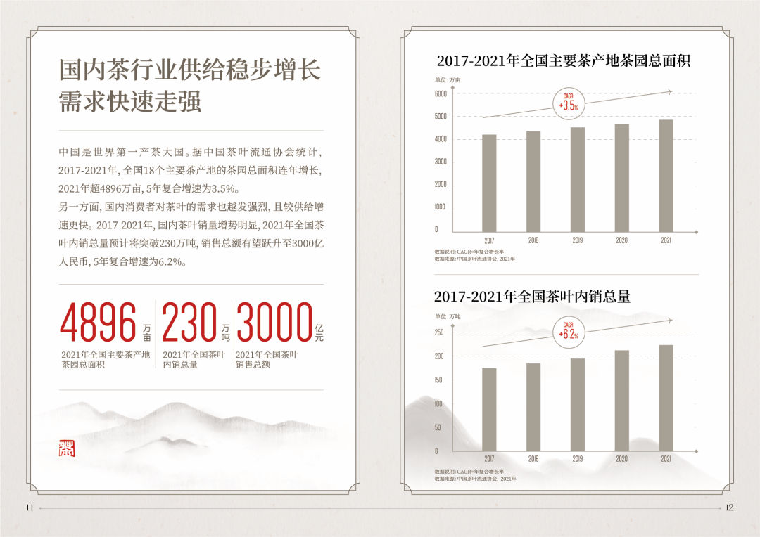 中国是世界第一产茶大国。中国茶叶流通协会统计,2017-2021年,全国18个主要茶产地的茶园总面积连年增长,5年复合增速为3.5%;同期,国内茶叶销量增势明显,2021年全国茶叶内销总量预计将突破230万吨,销售总额有望跃升至3000亿人民币,5年复合增速为6.2%。