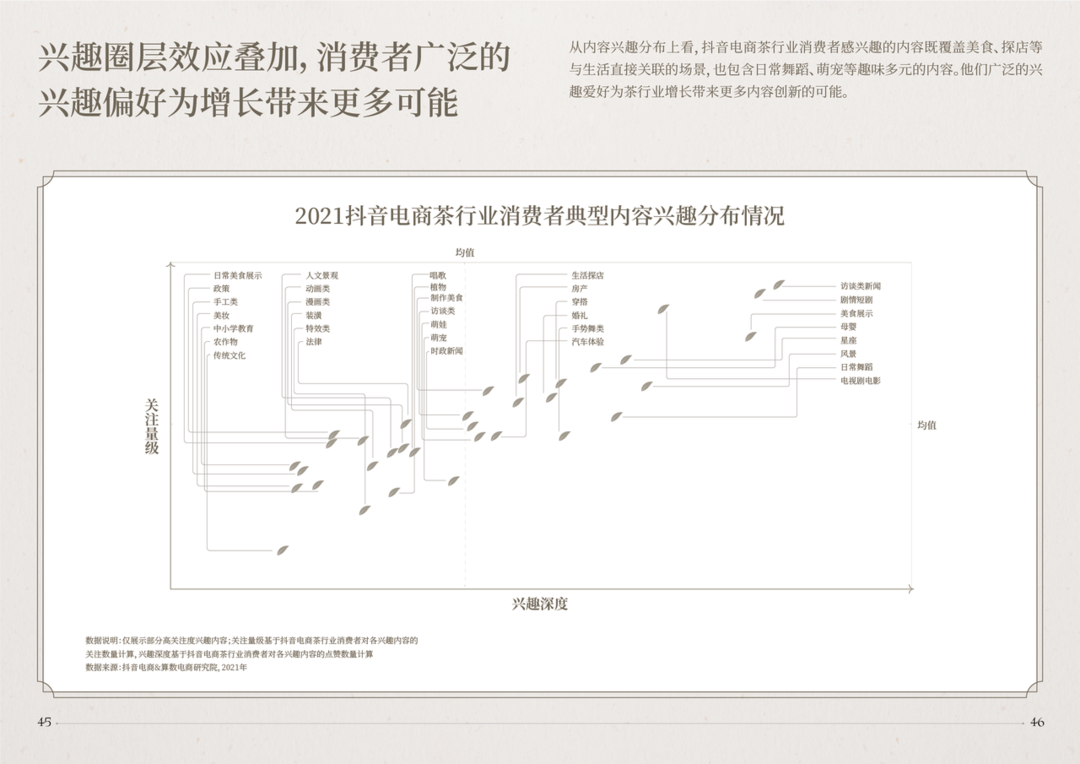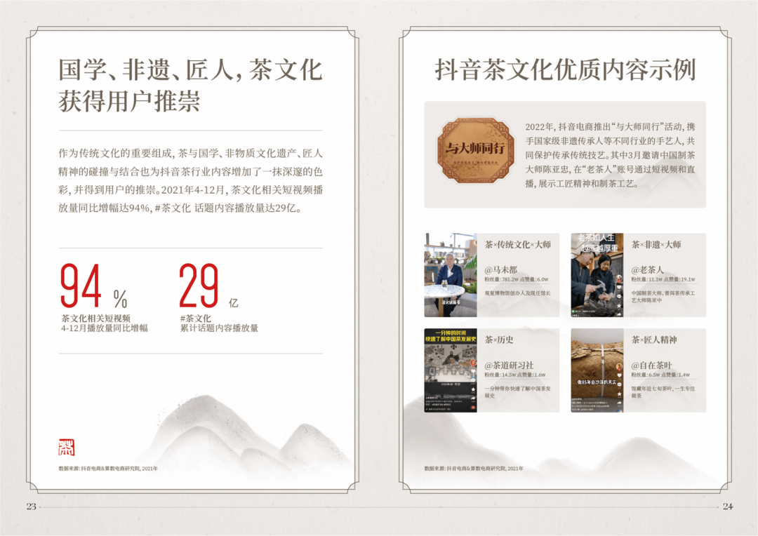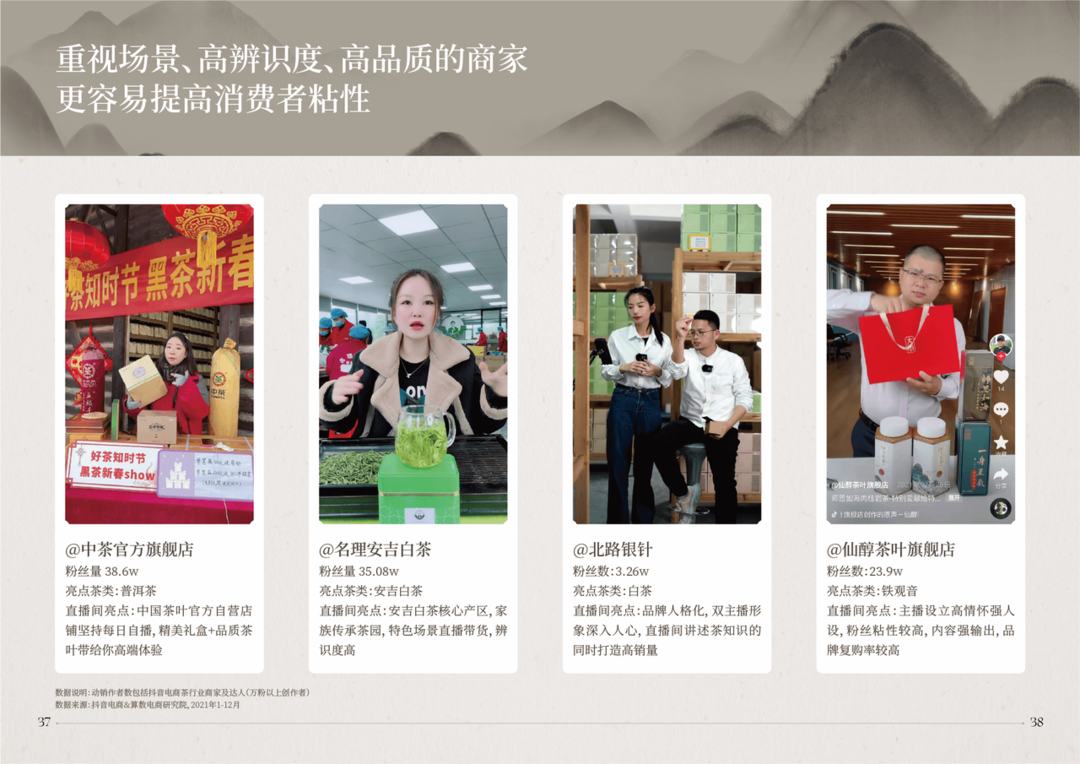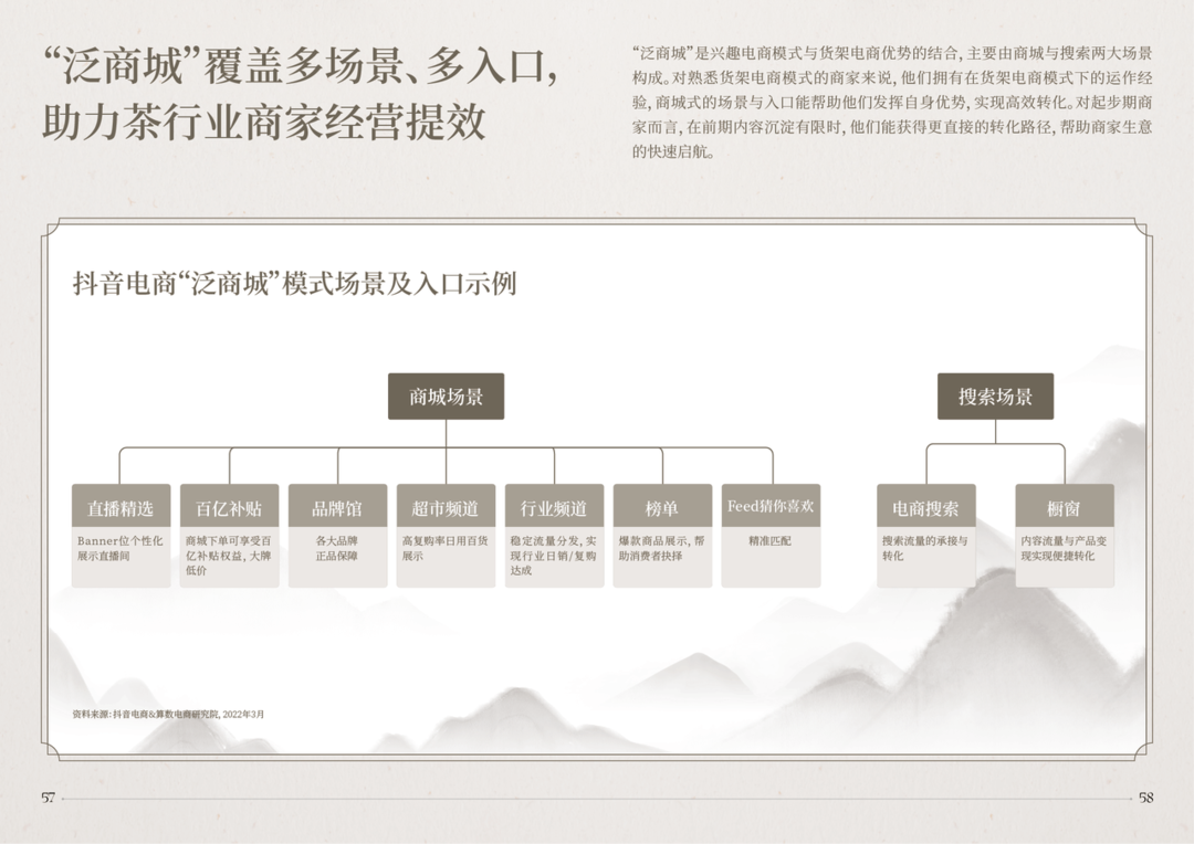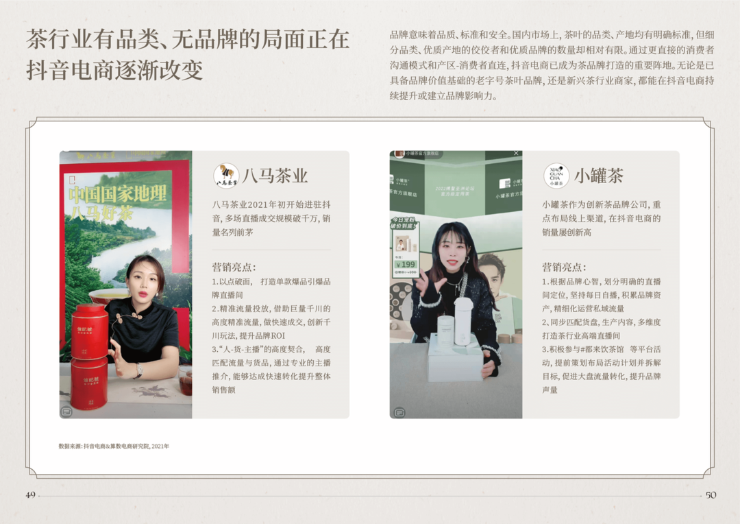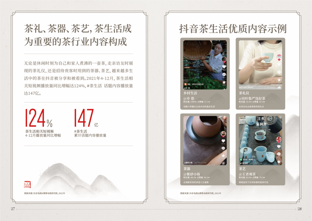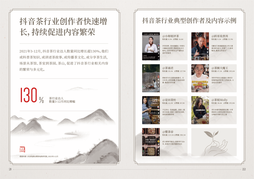 2020年开始,抖音电商为代表的兴趣电商模式不断走向成熟,内容化场景消费开启高速增长。茶行业在茶文化、茶知识、茶生活三大内容导向的促进下,于内容构成和电商生态两方面日益繁荣。