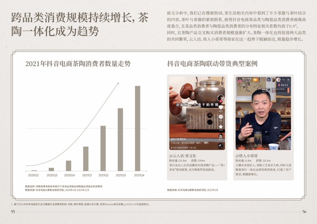 跨品类消费规模持续增长,茶陶一体化成为趋势。茶叶与茶器的紧密联系,使得抖音电商茶品类与陶瓷品类消费者画像高度重合,且茶品类消费者与陶瓷品类消费者的分布特征高度相关,且茶陶产品交叉购买消费者规模逐渐扩大。