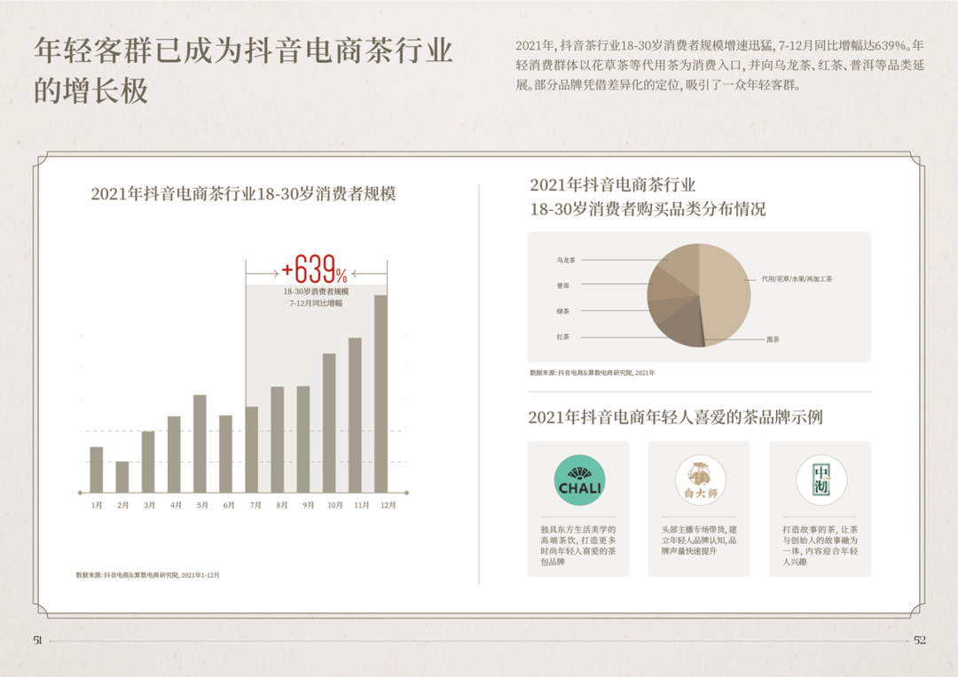 年轻客群已成为抖音电商茶行业的增长极。2021年,抖音茶行业18-30岁消费者规模增速迅猛,年轻消费群体以花草茶等代用茶为消费入口,并向乌龙茶、红茶、普洱等品类延展。部分品牌凭借差异化的定位,吸引了一众年轻拥趸。