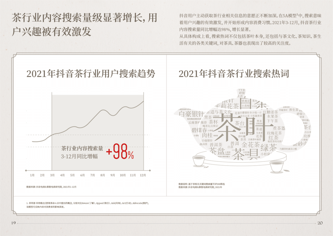 随着茶行业发展渐趋繁荣,越来越多的茶行业内容在抖音被分享和观看。2021年,抖音茶行业相关短视频播放量超千亿量级;二季度起,短视频发布量和播放量均有显著增长,内容生态日益繁荣。此外,春茶季(3月-4月中旬)、暑茶季(7月-8月中旬)和秋茶季(9月-10月中旬)三大茶季期间的内容需求量级明显高于其他月份,三大应季需求窗口期蕴含的商业价值值得茶行业商家和创作者重视。抖音用户主动获取茶行业相关信息的意愿正不断加深。在5A模型中,搜索意味着用户兴趣的有效激发,并开始形成内容消费习惯。2021年3-12月,抖音茶行业内容搜索量同比增幅达98%,增长显著。从具体构成上看,搜索热词不仅包括茶叶本身,对茶具、茶器等其他相关内容也表现出了较高的关注度。在抖音电商,茶行业有品类、无品牌的局面正逐渐改变。通过更直接的消费者沟通模式和产区-消费者直连,抖音电商已成为茶品牌打造的重要阵地。无论是已具备品牌价值基础的老字号茶叶品牌,还是新兴茶行业商家,都能在抖音电商持续提升或建立品牌影响力。