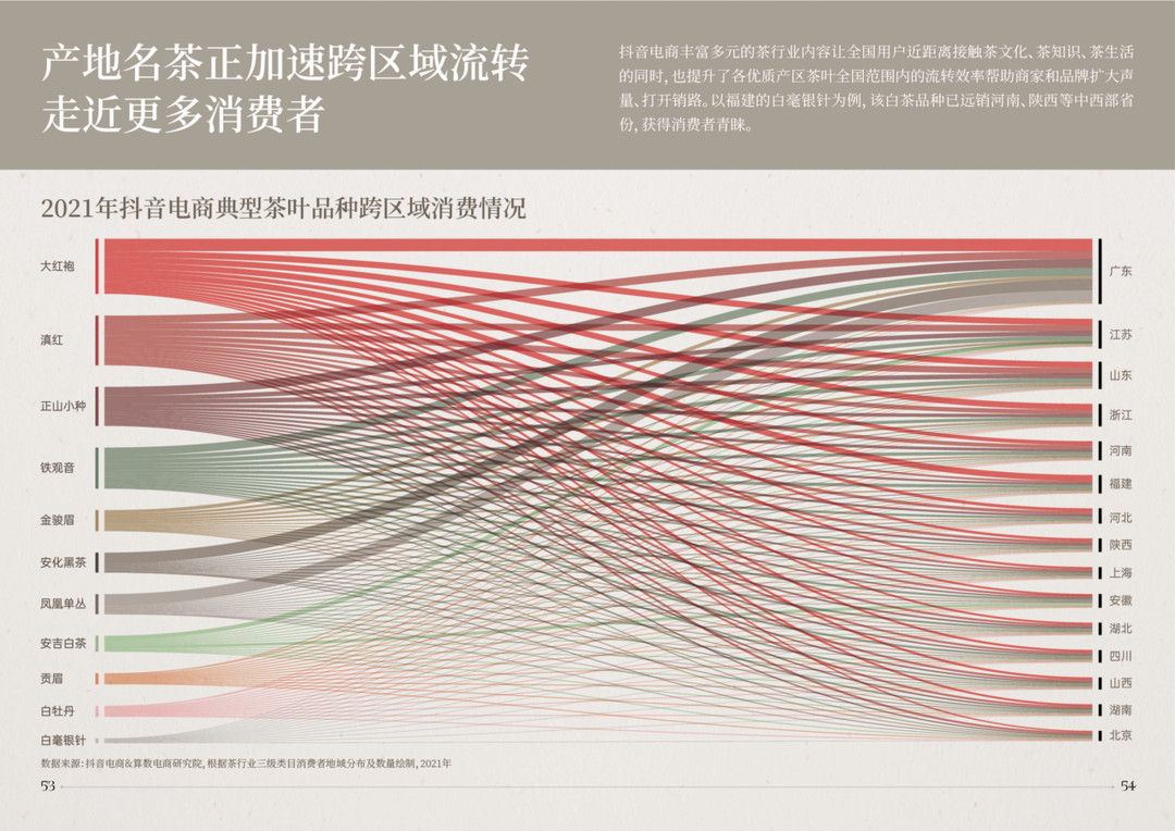 产地名茶正加速跨区域流转,走近更多消费者。抖音电商提升了各优质产区茶叶全国范围内的流转效率,帮助商家和品牌扩大声量、打开销路。以福建的白毫银针为例,该白茶品种已远销河南、陕西等中西部省份,获得消费者青睐。