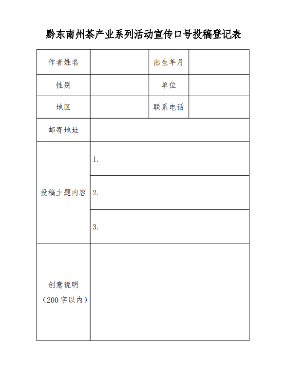 邮件标题注明“黔东南州茶产业系列活动宣传口号(地区及作者姓名)”,邮件内容附作者姓名、职业(单位)、地址及联系电话。