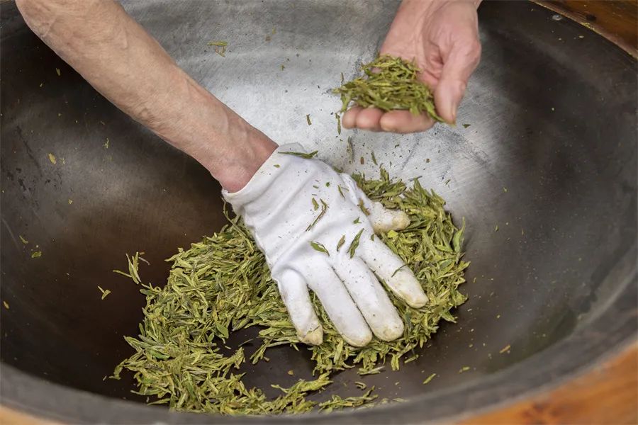 看后上手,捻起一两片茶叶,用手指捏一捏,搓一搓。