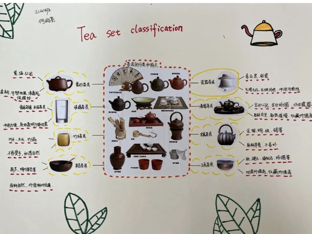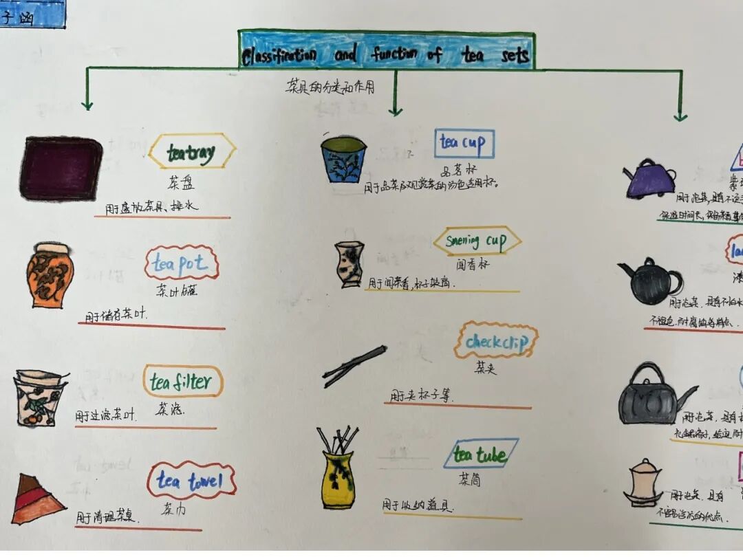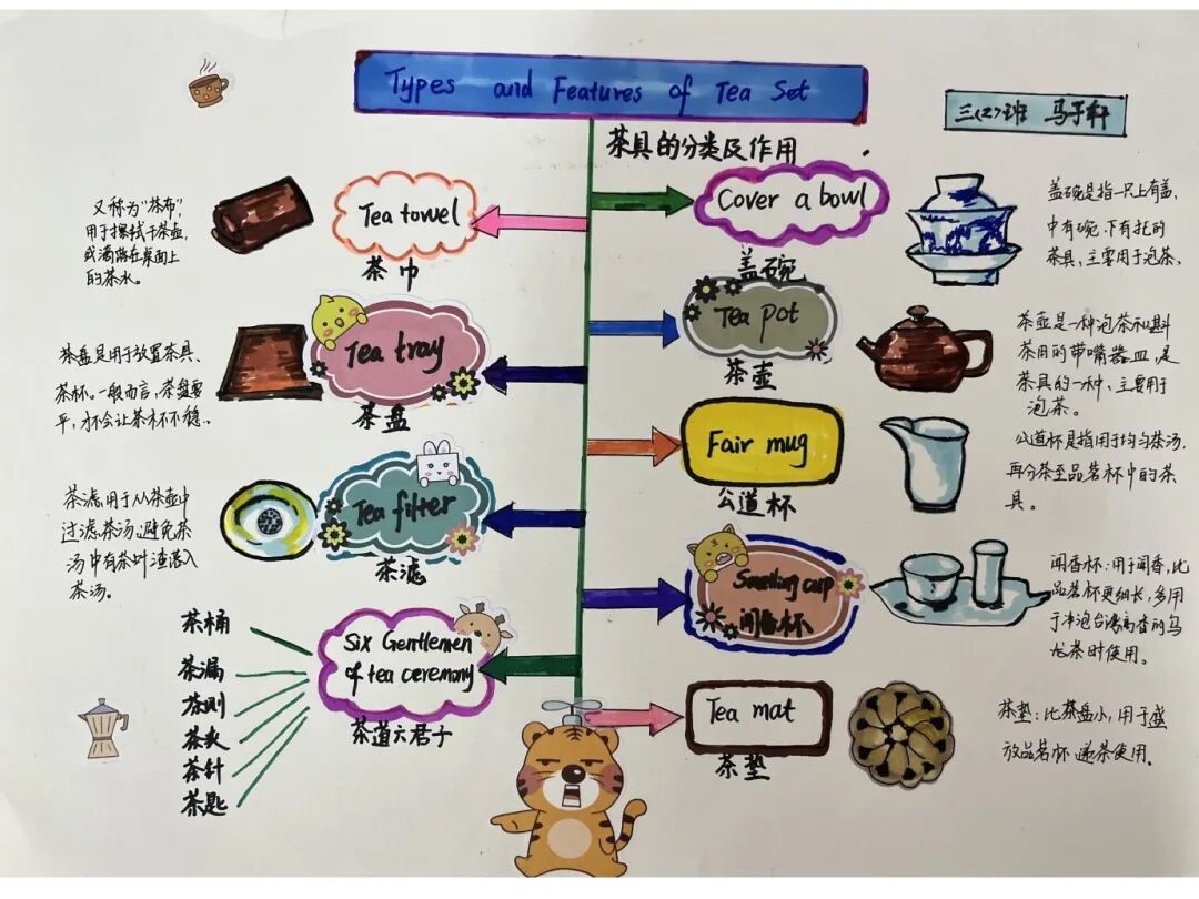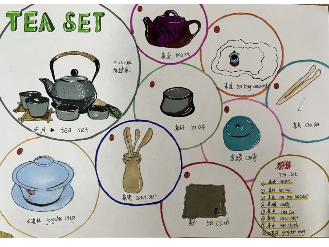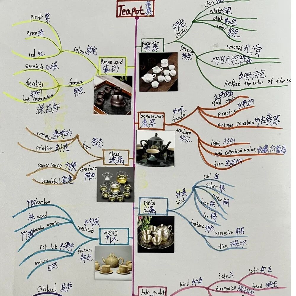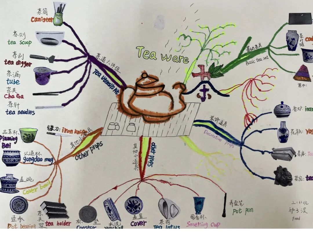 经过一段时间学习研究,学生们用思维导图的形式,展示了学习的结果:有的学生画出精美的茶具,并用英语进行介绍。