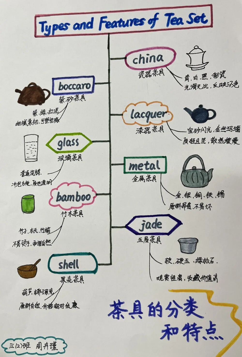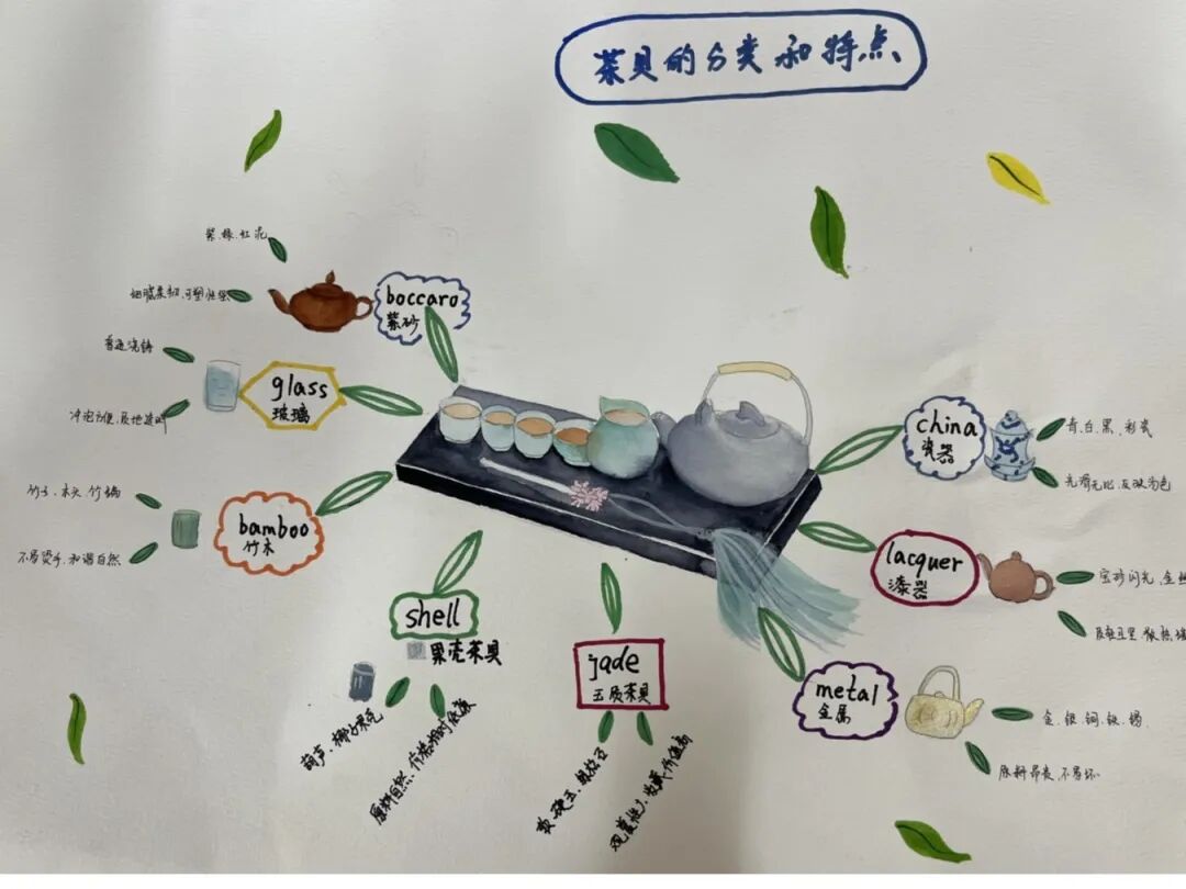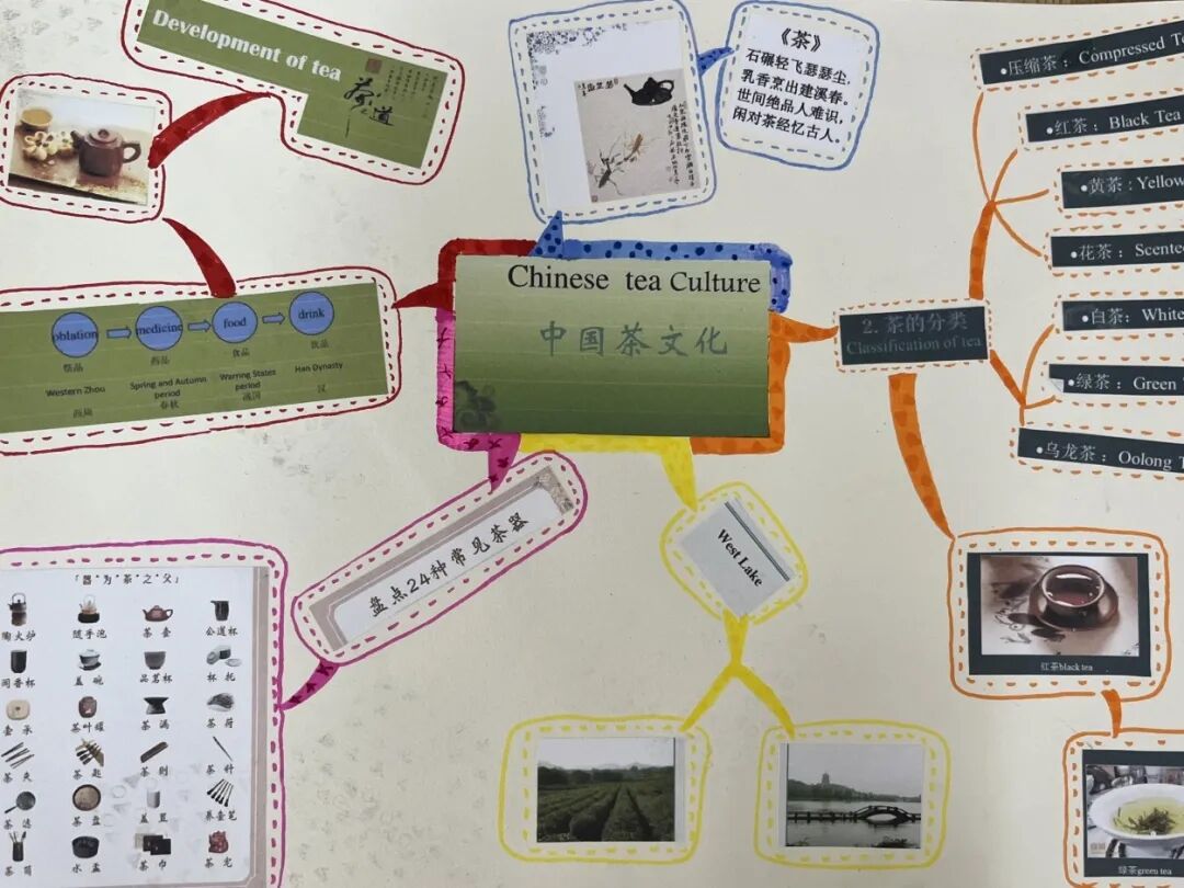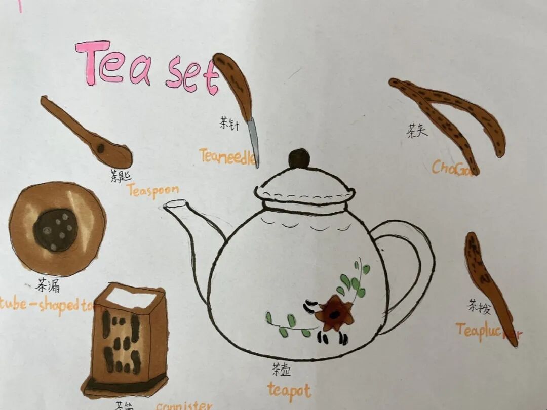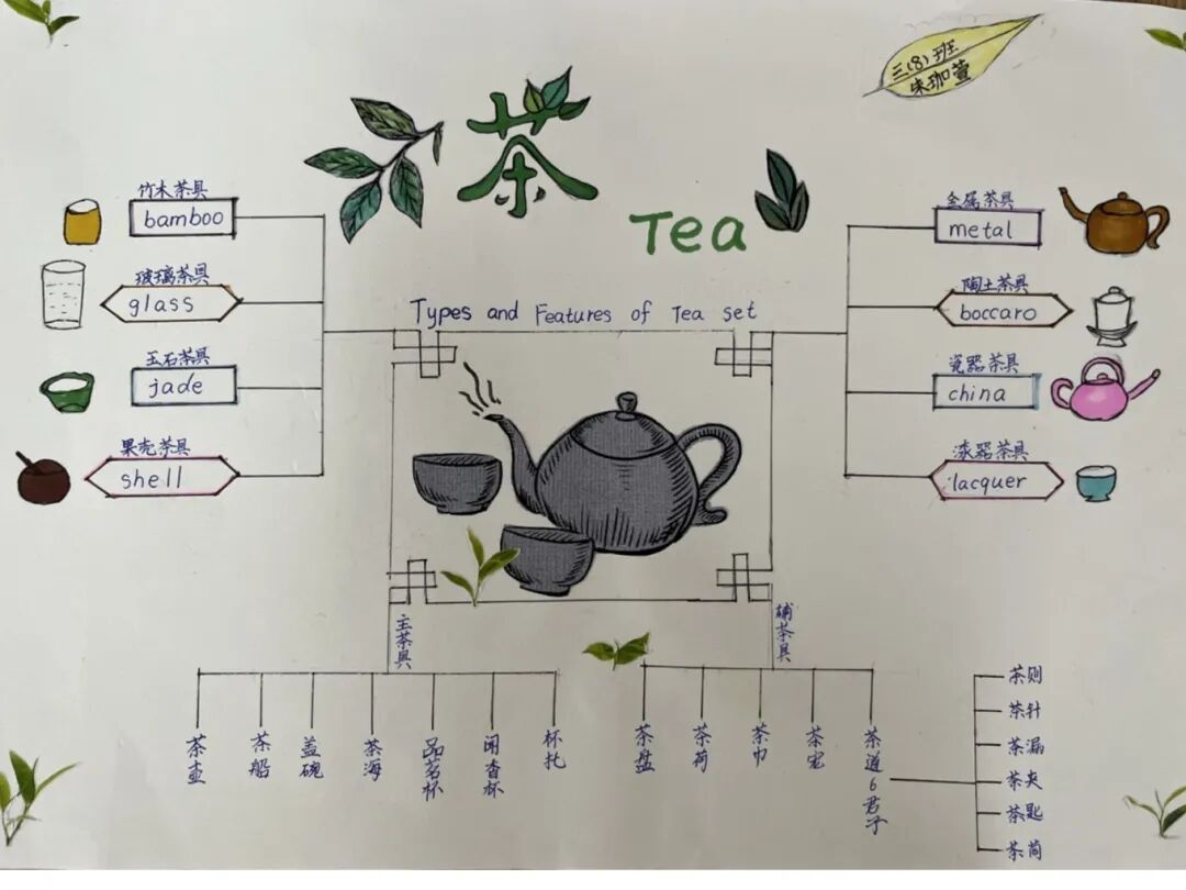 经过一段时间学习研究,学生们用思维导图的形式,展示了学习的结果:有的学生画出精美的茶具,并用英语进行介绍。
