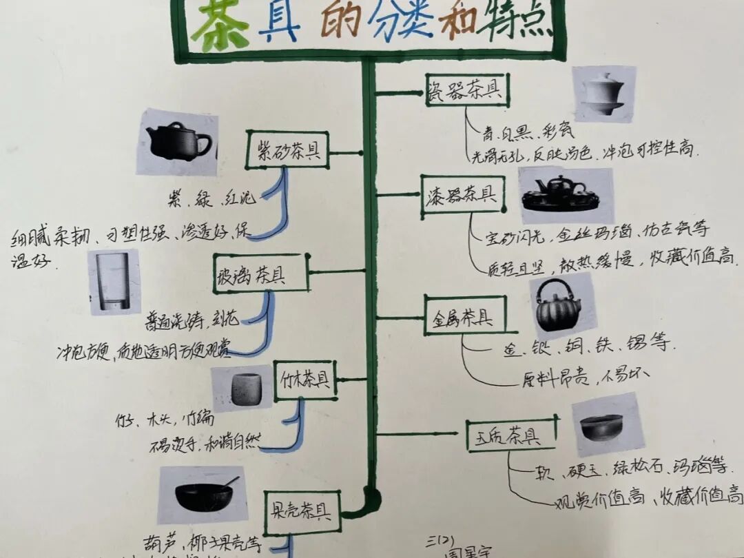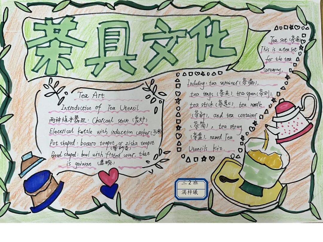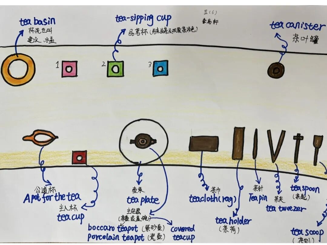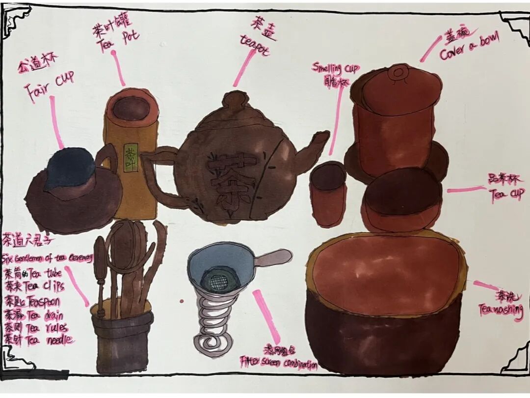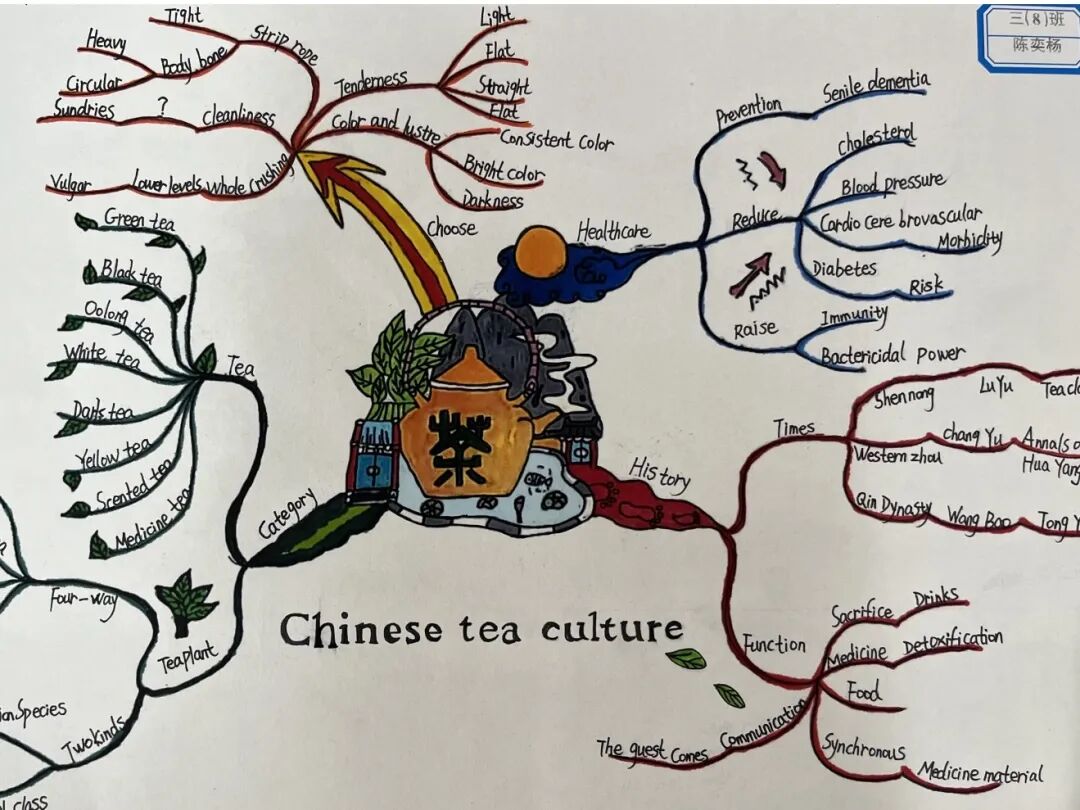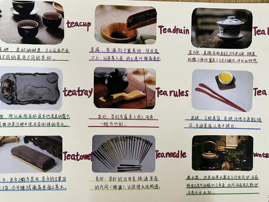 经过一段时间学习研究,学生们用思维导图的形式,展示了学习的结果:有的学生画出精美的茶具,并用英语进行介绍。