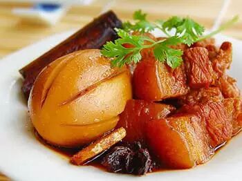 原料:五花肉300克、鸡蛋3个、酱油、冰糖、葱2段、八角1粒、桂皮1段、黄酒