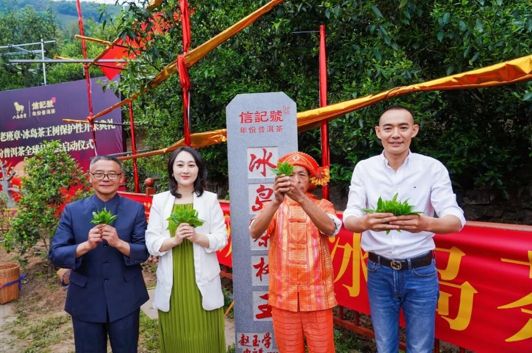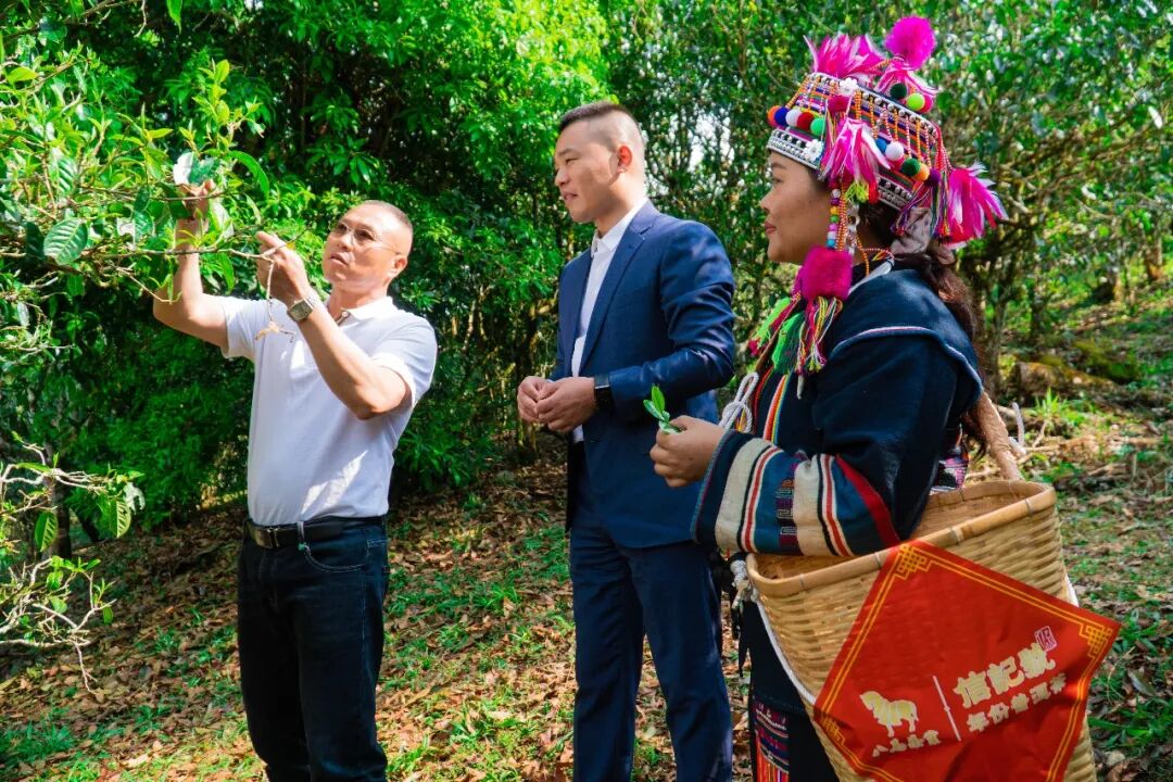 ▲2022冰岛老寨茶王树春茶采摘开启,左一为云南省院士(专家)工作站龚正礼专家工作站首席专家龚正礼,左二为八马茶业信记号事业部负责人姜雨桐