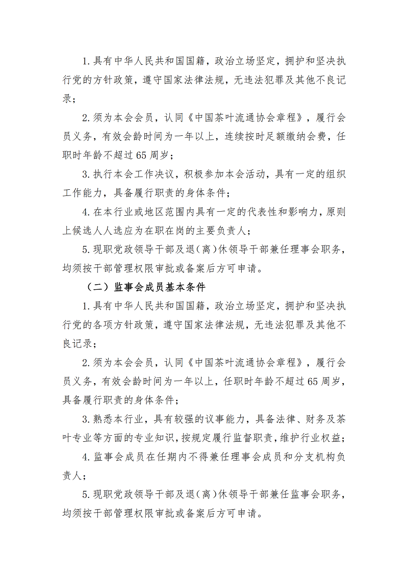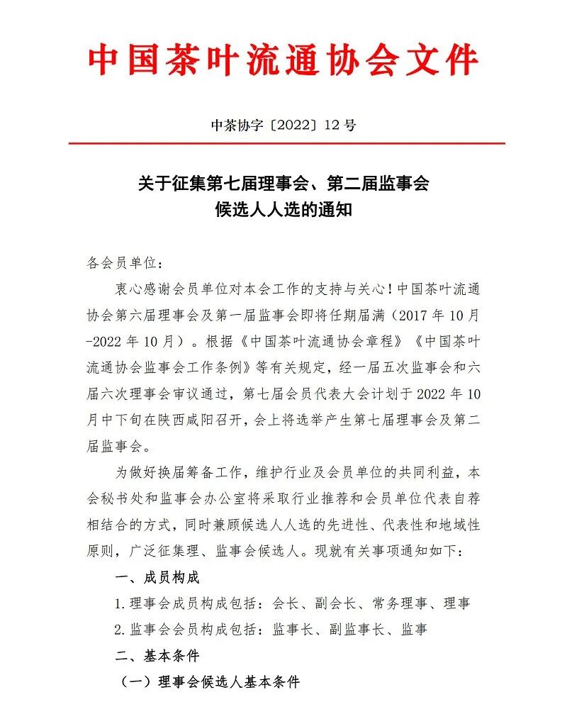 【通知公告】中国茶叶流通协会关于征集第七届理事会及第二届监事会候选人人选的通知