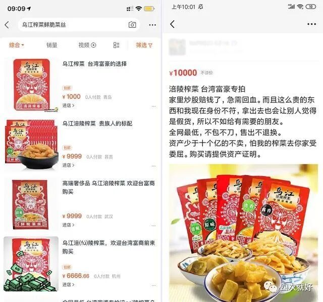 毕竟现在榨菜都买到这个价格了,最低是1000块钱起步,稍微高一点的要10000块钱!而且还号称是“贵族的标配”,右边这个更是上面写着:台湾富豪专拍,资产少于十个亿的不卖……哈哈哈,现在的网友真是太有生意头脑了~