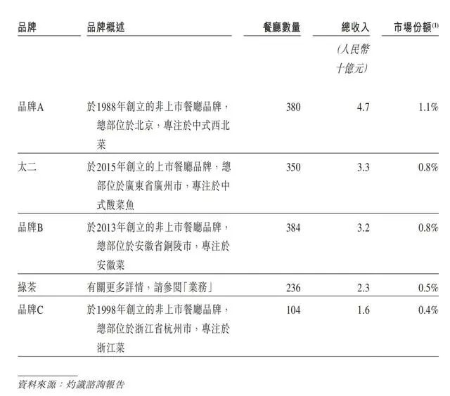 招股书介绍,绿茶餐厅开业第二年就获大众点评“年度最受欢迎餐厅Top50”,此后便开始全国扩张,目前已覆盖所有一线城市。招股书显示,2021年,绿茶集团在休闲中式餐饮市场中占据0.5%的市场份额,位列第四;中式酸菜鱼品牌太二的市场份额则为0.8%,排名第二。