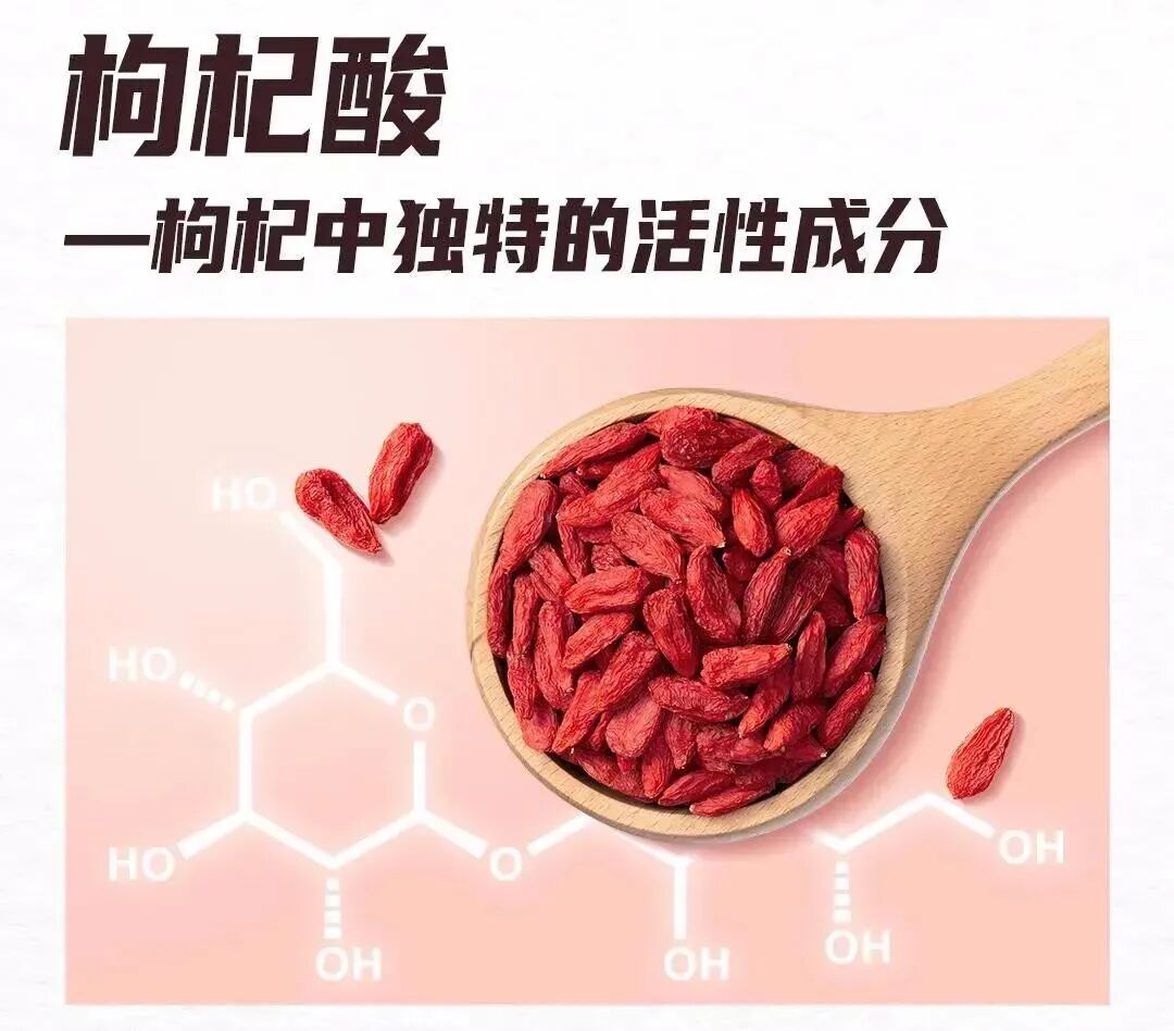 枸杞多糖是最重要的营养活性成分之一,多项现代医学研究证实,其具有抗氧化、抗衰老、免疫调节、神经保护、降血糖等多种健康功效。枸杞酸