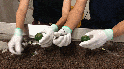 ▲ 人工辅助机器开果,确保每个开口大小一致