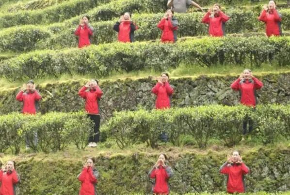 中国日报福州4月14日电 4月13日,武夷山茶人在九龙窠大红袍母树下绿色生态茶园呼喊“采茶咯!茶叶丰收咯!”。当日,武夷山市在九龙窠大红袍母树下绿色生态茶园举行“喊山祭茶暨庆茶叶丰收”仪式。近年来,武夷山践行“绿水青山就是金山银山”理念,建设绿色生态茶园,统筹推进茶文化、茶产业、茶科技发展,茶产业已是武夷山乡村振兴的主导产业。
