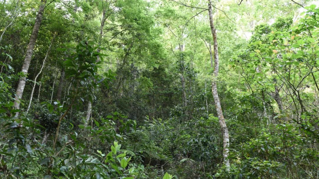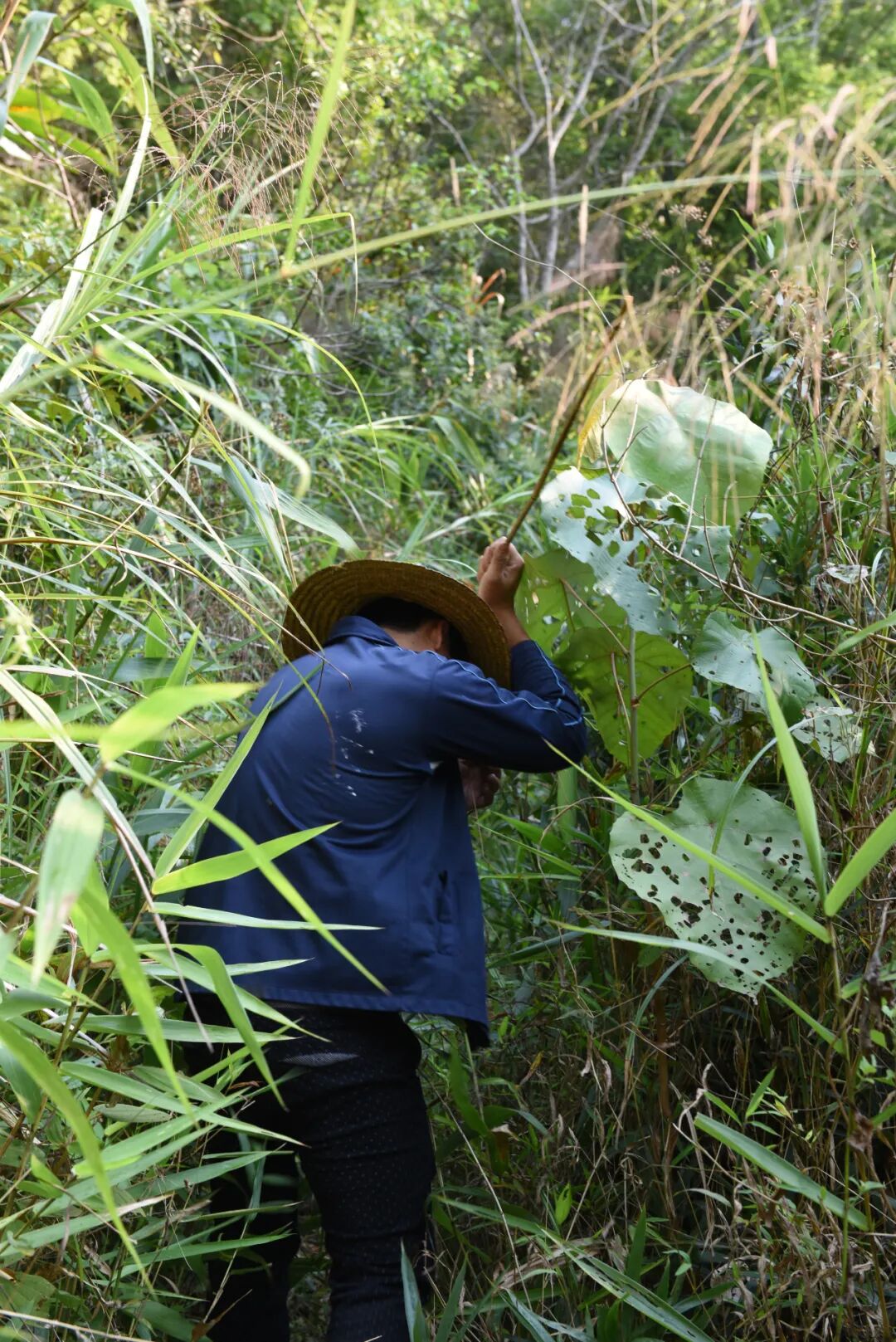 △ 黎族小伙在前头拿着竹竿艰难穿越黎族阿姨的小儿子带我们上山,小伙子20多岁,长得黝黑壮实。清晨的太阳刚刚升起,我们就已经行走在五指山里。穿越于齐头高的蒿草丛间,戴着草帽黎族小伙拿着竹竿敲打着路边,虽然生长在大山,他说他最怕蛇。我对这里的未知去处,充满憧憬也带着不安。大山深远,路也不知道会去往哪儿,有时候未必就有路,那是采药人留下的小道。(五指山水满乡茶厂的郑总2020年3月告知,我去过的这片森林现在已经是国家雨林公园的核心区,严禁进入,以后再要去就难了)。五指山蚂蟥很多,特别在小溪流,或者在一些接近干涸的水沟里。黎族小伙聊及五指山很神奇也很危险,不熟悉的人不能轻易去闯。他坚信有山神,必须要尊重,据说,有人曾在山里睡着了,醒来时却发现身在另一座山呢。我们与自然的联结,来源于生命深层的渴求;茶生于寂静的山水间,人们喜爱饮茶,也原本来自于这样朴素的渴望——通过品饮联结到自然。