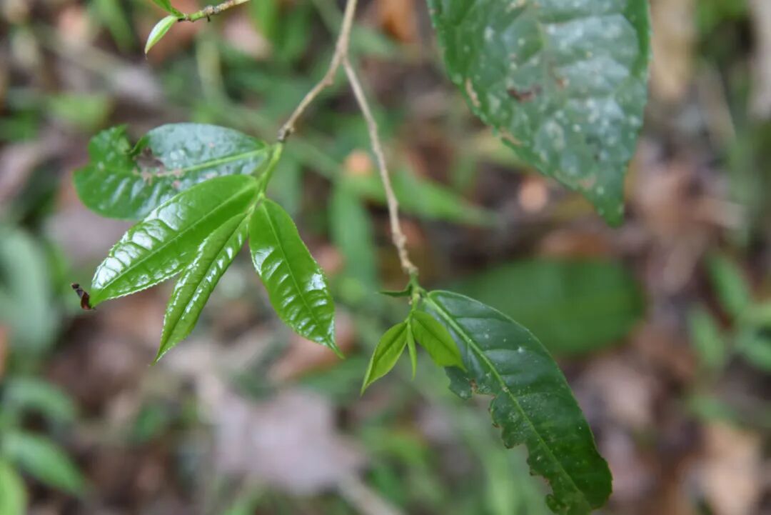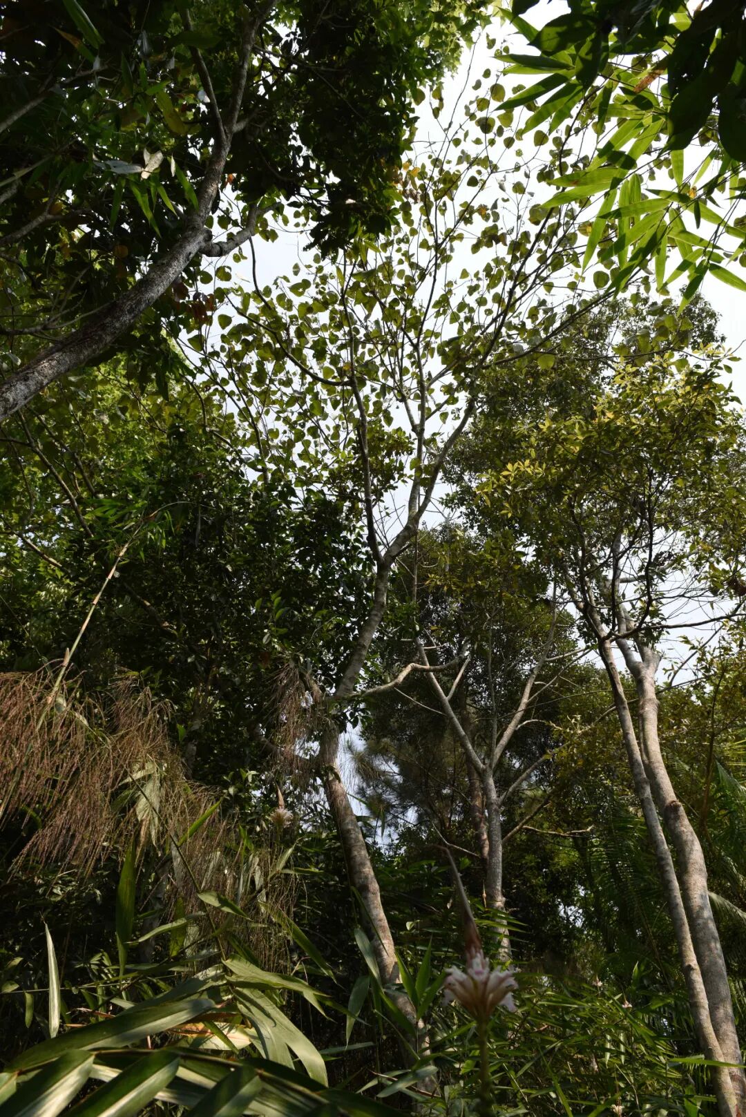 △ 茶树与五指山的杂树共生为了采摘茶叶,靠近村落的一些野生古茶树也曾被矮化,或多被人砍斫枝干后采摘鲜叶,但它们的生命异常顽强,在密林里与热带植株共生共长。因为云南古树茶的热潮,也有人专门来寻找海南的野生古树茶。黎族阿姨称,前两天就有重庆的朋友刚来采过茶。这几棵野生古树茶长势良好,没有被人砍伐过,散落在林间。我摘了芽叶放到嘴里,苦涩刺激,野气十足。黎族阿姨说,这些古树茶拿来做红茶挺好喝的,不过很难采,要她儿子才爬得上去,一个人爬到那么高的茶树上,半天也只能采几斤鲜叶下来,因此并没有形成产量。