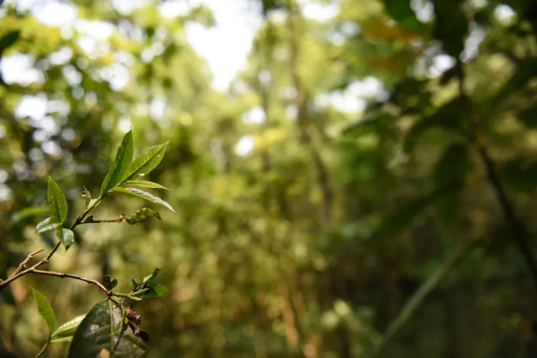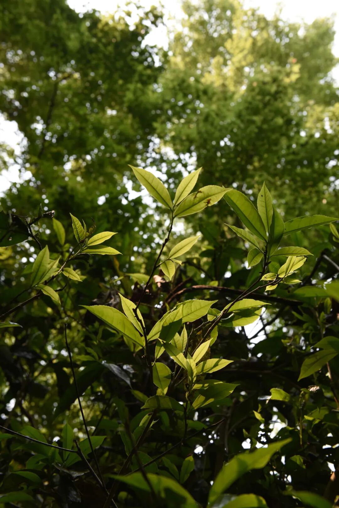 △ 主干银白色的茶树与姜花等植被共生太阳时而为云朵遮住,溪流流淌着快乐,偶尔遇到荒弃的田野,空旷处仍旧有纯蓝的天空。转过了山头,山间流下细小的瀑布,再向前走,荒山已然无路,蚁虫有自己的王国,来回奔忙,拖运着食物。在这里我们发现了几株古茶树,枝干细长,与其它绿树植株似乎无异,只有在碎落的阳光下,才看到叶子有明显的锯齿、泛着金绿的色泽。这些茶叶有天然的清香,更接近果香,芽头吃起来苦后回甘。采摘鲜叶时,需要把枝条拉得很低,我们一人负责压低枝条,然后另一人在树下采摘。