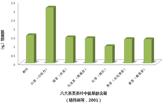 以茶叶的加工工艺对氨基酸含量影响为例。杨伟丽等研究表明,鲜叶氨基酸含量为1. 59%,加工后只有白茶明显增加,比鲜叶增加将近1倍,且比其余五类茶含量高1.13-2.25倍,而以红茶中含量最低。以上变化说明,氨基酸在六种茶类的差异均与加工技术和品质风味的形成分不开。
