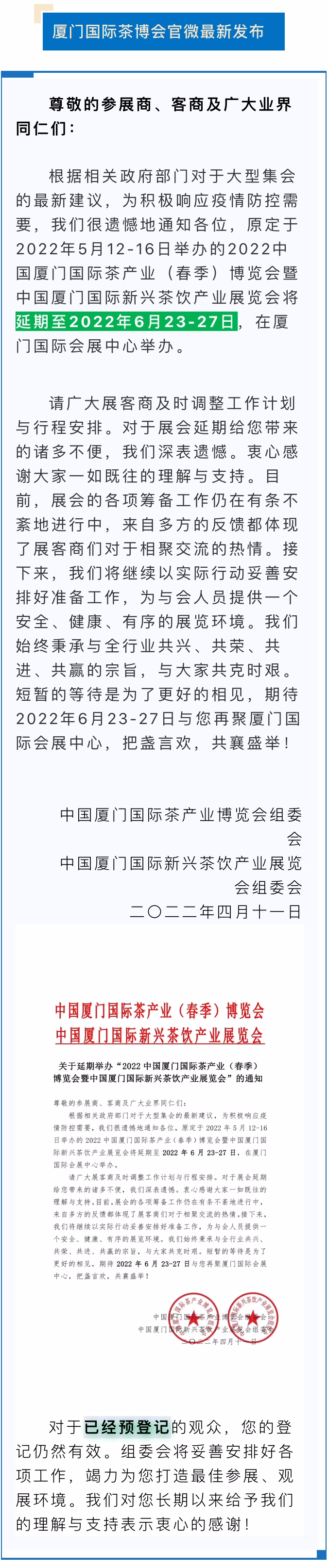 宣布延期2022厦门国际茶产业(春季)博览会