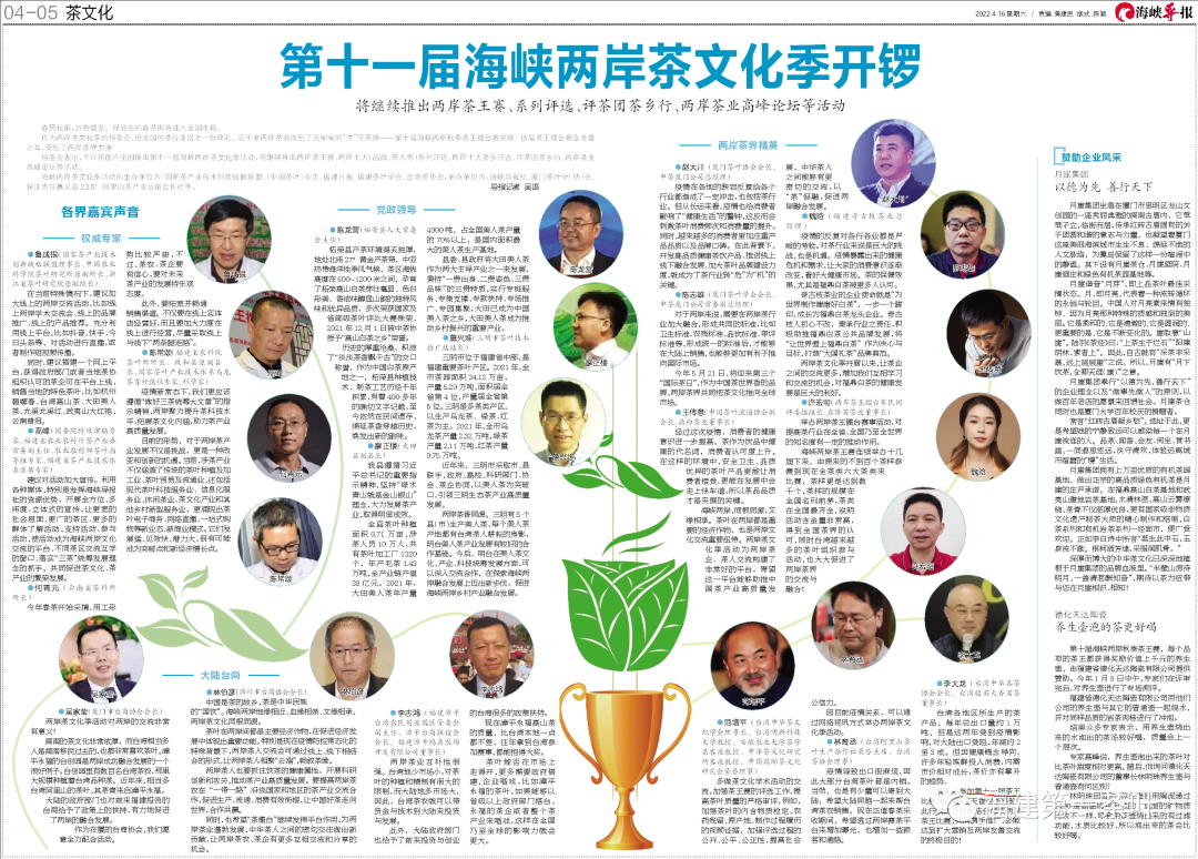 他认为福建与台湾两岸茶产业可以进行很好的融合发展,不仅可从茶叶的种植、加工、营销、饮用等各个环节,以及技术与品牌等各方面进行对接合作,而且还可以从茶文化上进行交流融合,这将有助于两岸茶产业的发展,有助于提升两岸茶产业的竞争力。